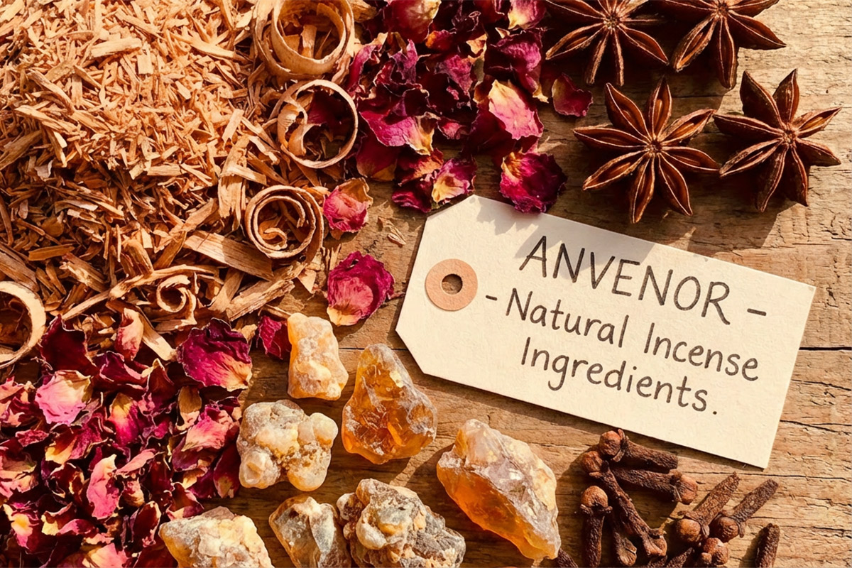 In unseren Anvenor Räucherwaren kommen ausschließlich hochwertige, natürliche Zutaten zum Einsatz. Dazu gehören edle Hölzer wie Sandelholz und das Holz des Tabu-no-ki-Baumes (Persea thunbergii), sowie Harze wie Benzoe und Weihrauch. Ergänzt werden diese durch fein abgestimmte Kräuter und Gewürze wie Anis, Nelken oder Guggul und zarte Blüten wie Rosen. Diese sorgfältige Auswahl der Ingredienzien trägt maßgeblich zum besonderen Dufterlebnis von Deine Anvenor Räucherwaren bei.