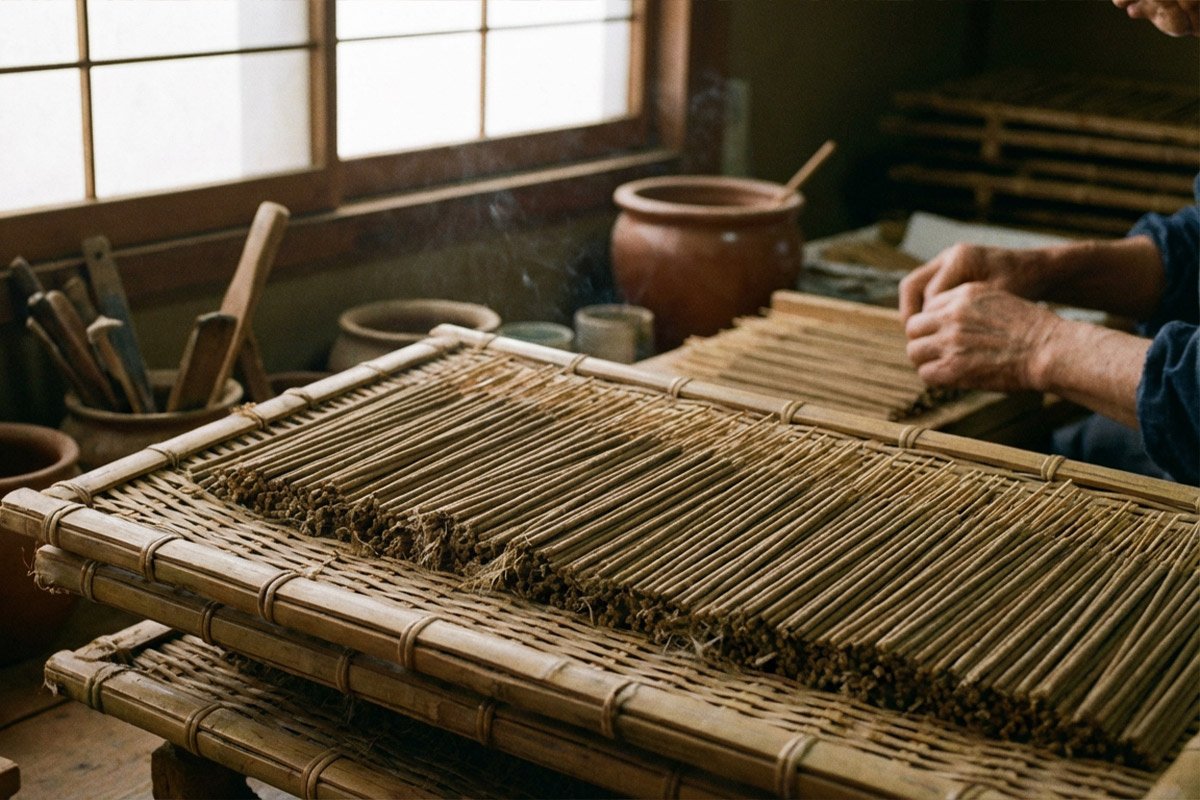 • Natürliche Trocknung: Die entstandenen Stäbchen werden sorgfältig geschnitten und dann langsam getrocknet.