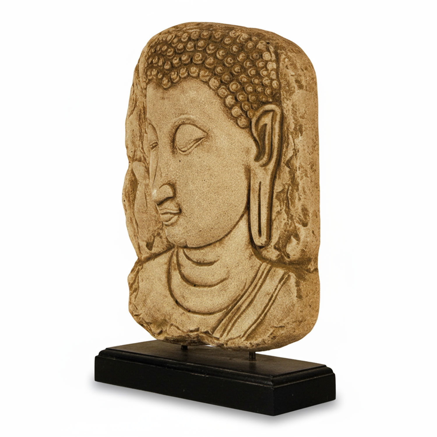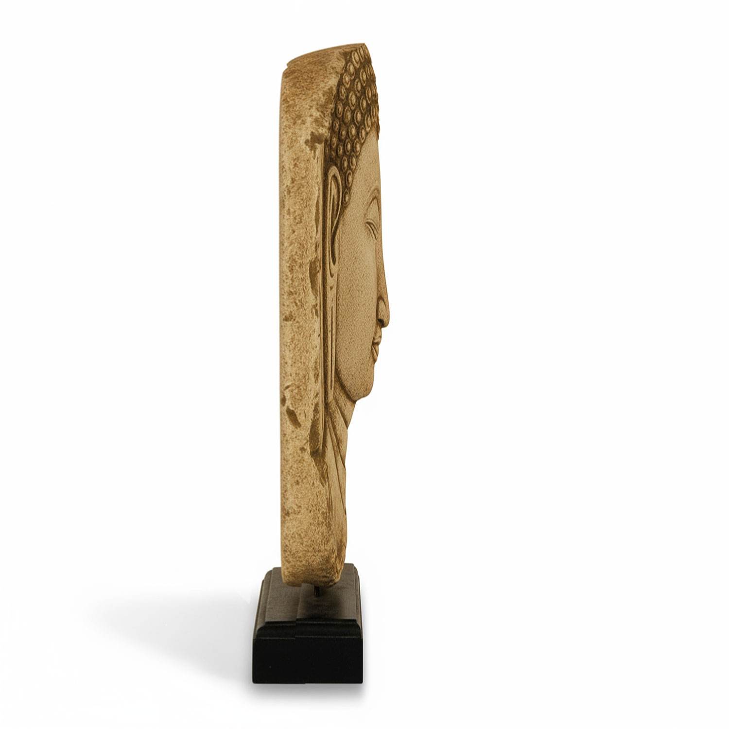 Buddha Büste – Naturstein-Relief, 23 cm mit dunkel-schwarzem Holzsockel