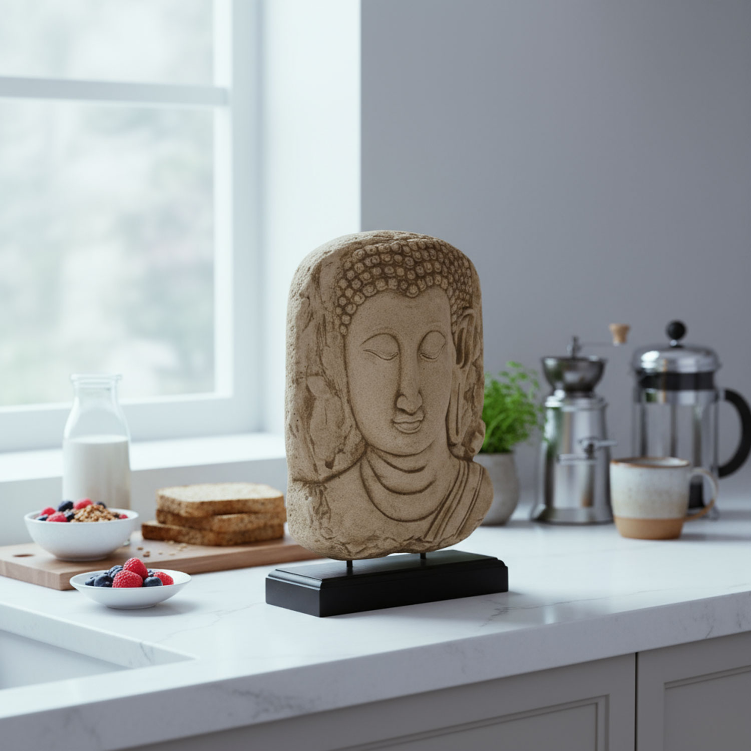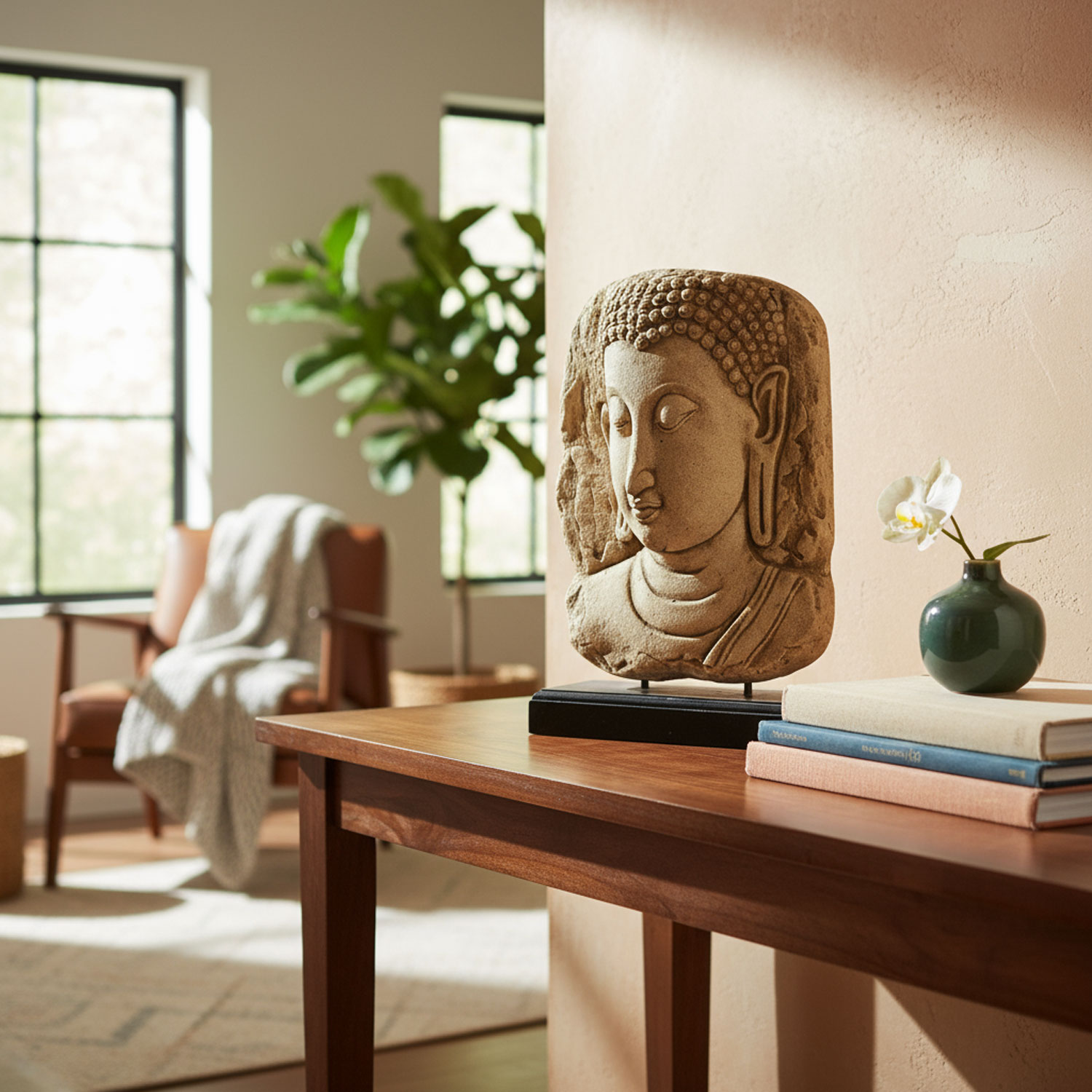 Zwischen Terminen schweift dein Blick zur Buddha-Büste: das zarte Lächeln, die halb geschlossenen Augen – ein stiller Tipp, für einen Atemzug anzuhalten. Dieser kurze Moment Erdung begleitet dich durch den Tag.