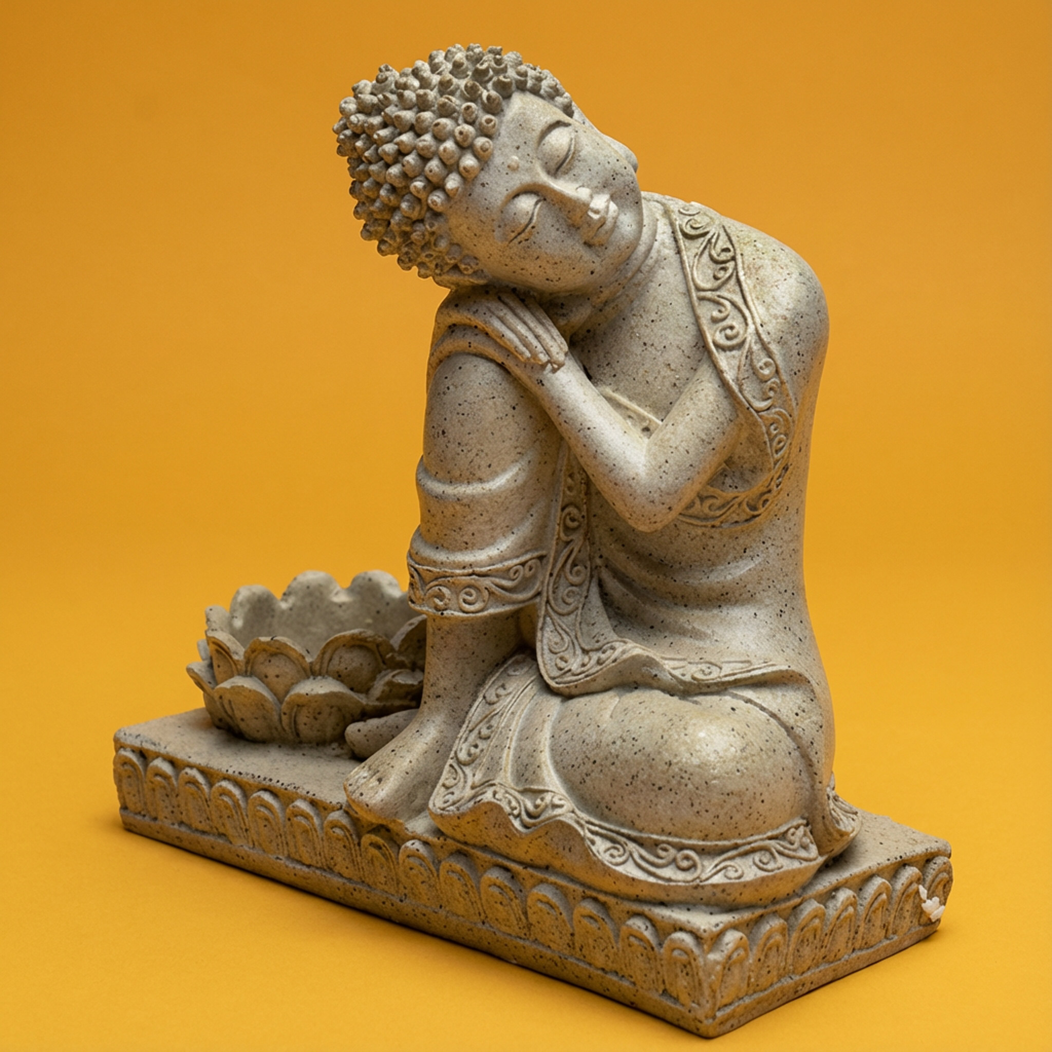 Steingraue Buddha Statue mit Lotus Kerzenhalter Höhe etwa siebzehn komma fünf Zentimeter aus robustem Polyresin. Natürliches Stone Finish mit feinen Konturen und stimmungsvollem Teelicht.