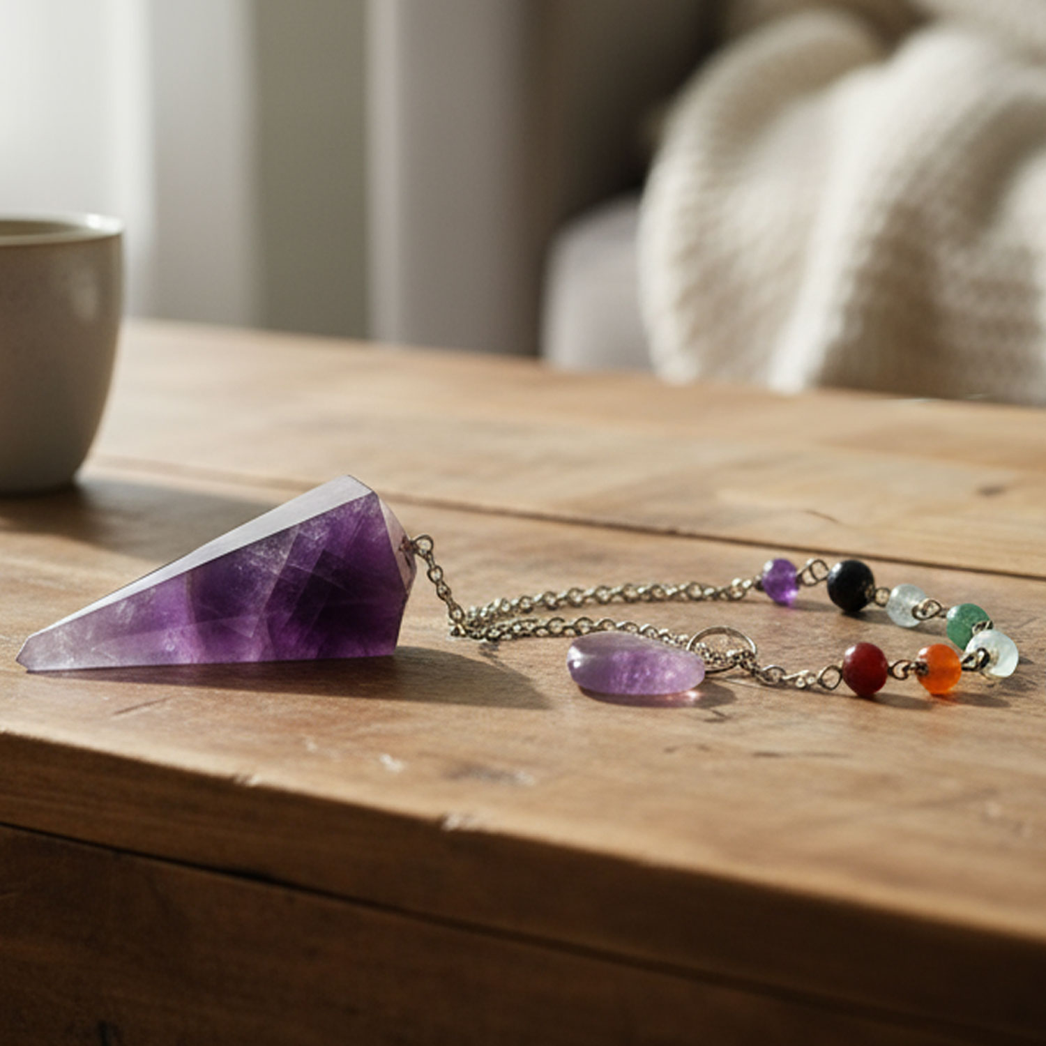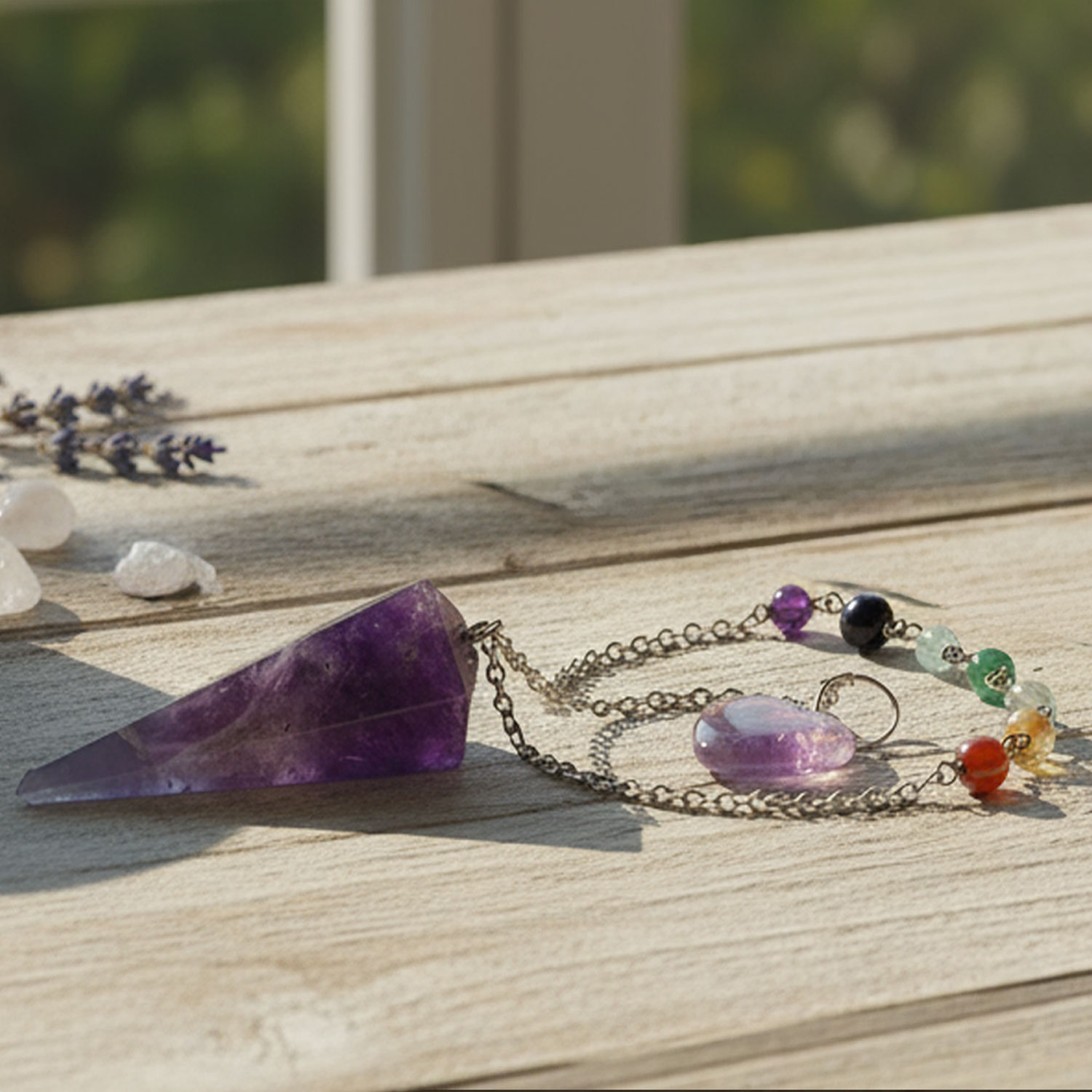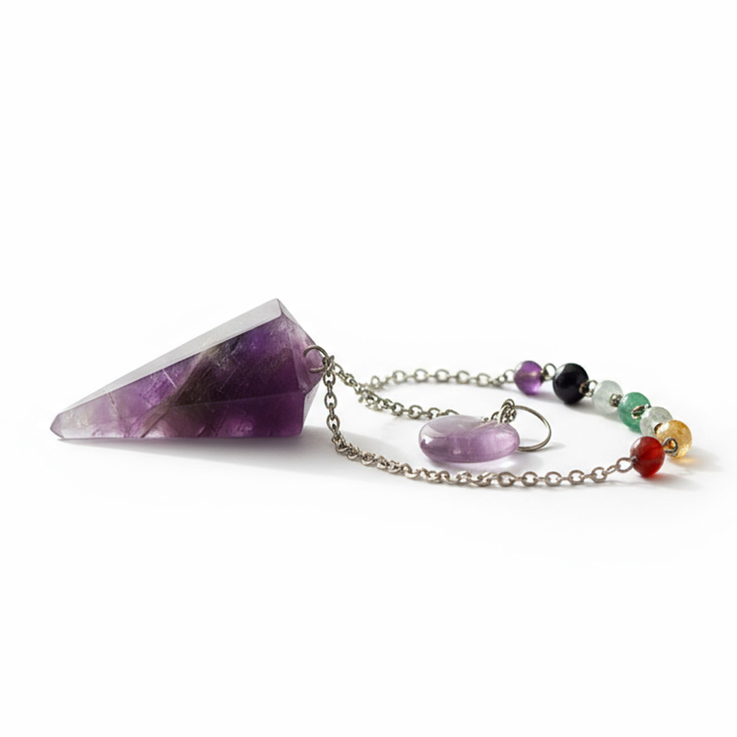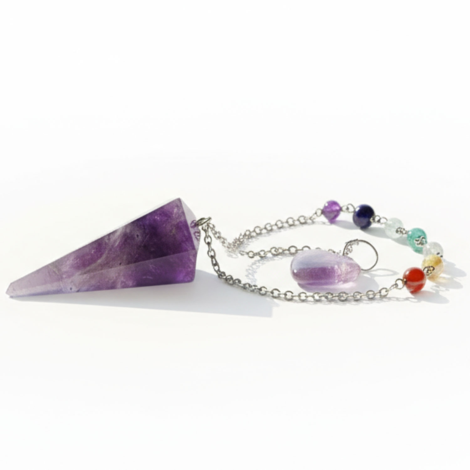 Edles Amethyst Chakra Pendel mit Kette und luxuriösen Halbedelsteinen in den Farben der Chakren : 1. Amethyst, 2. Rosenquarz, 3. Bergkristall, 4. Grüner Aventurin, 5. Goldhaltiger Quarz, 6. Karneol, 7. Roter Jaspis.