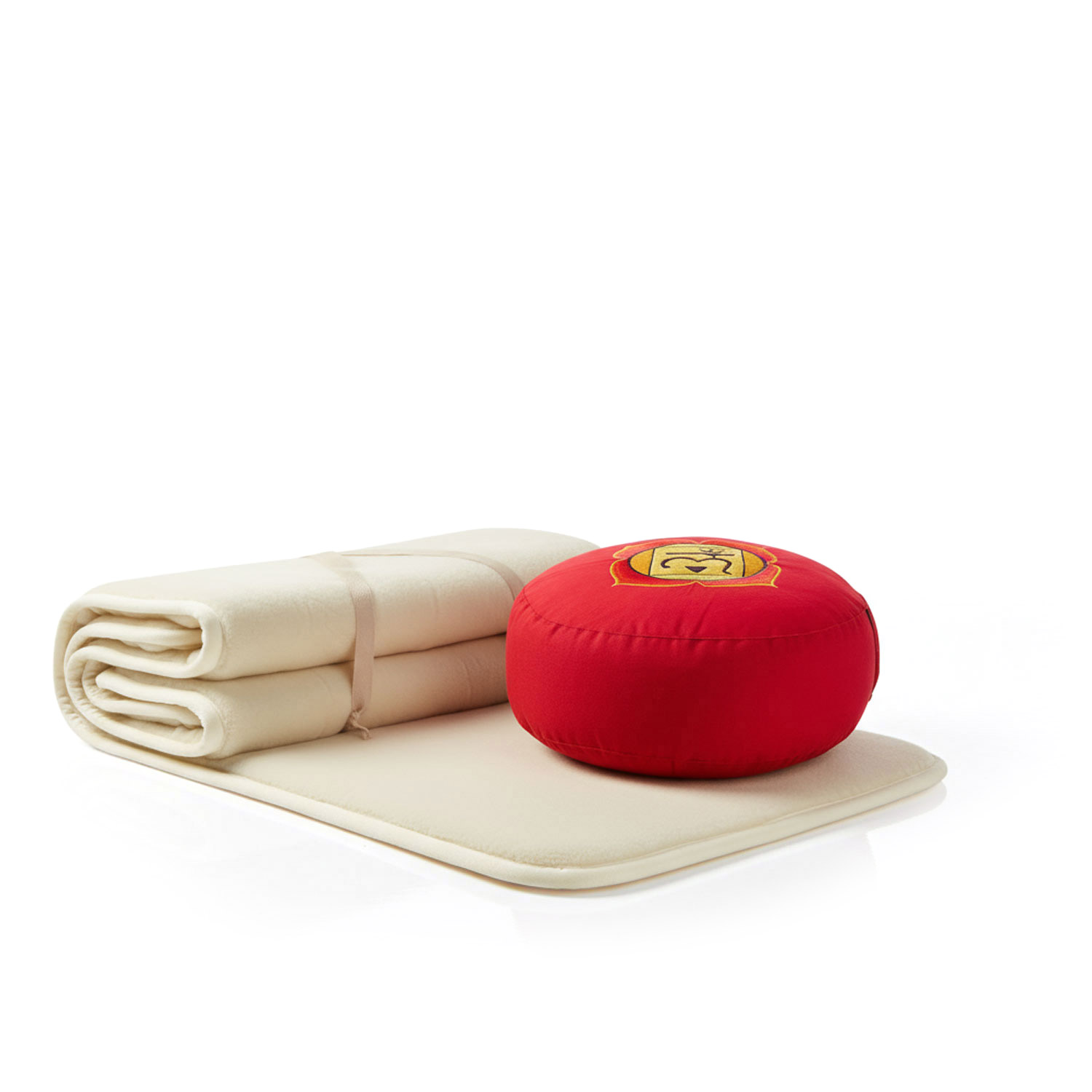 - Komfort Set: warme Matte für Bodenarbeit plus ergonomisches Chakra Kissen für aufrechtes Sitzen.