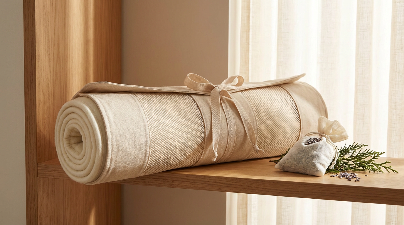 - Trocken und dunkel lagern: Bewahre deine Matte an einem trockenen, gut belüfteten Ort auf. Vermeide feuchte Räume oder das lange Lagern in einer geschlossenen Tasche, die keine Luftzirkulation zulässt. Direkte Sonneneinstrahlung sollte vermieden werden, da UV-Licht die Fasern spröde machen und die Farbe ausbleichen oder die Matte vergilben kann. (Mehr dazu findest du auch in unserem Blogbeitrag zur Aufbewahrung von Yogamatten).
