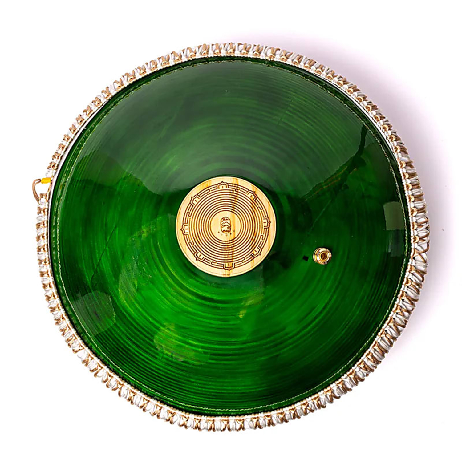Die 15‑tönige Hybrid-Klangtrommel verbindet die melodische Präzision einer Tongue Drum mit der räumlichen Tiefe einer Handpan. Die Spielfläche aus weißem Titanstahl ist mit einem stilisierten Auszug aus dem Herzsutra verziert und wird von einem tiefgrünen Korpus aus Birkenholz ergänzt, der für einen warmen, voll klingenden Resonanzkörper sorgt. Ein herausnehmbarer Holzstopfen an der Unterseite ermöglicht das Erzeugen ausgeprägterer Obertöne. Das Instrument ist somit sowohl optisch als auch klanglich ein hochwertiges Hybridmodell.