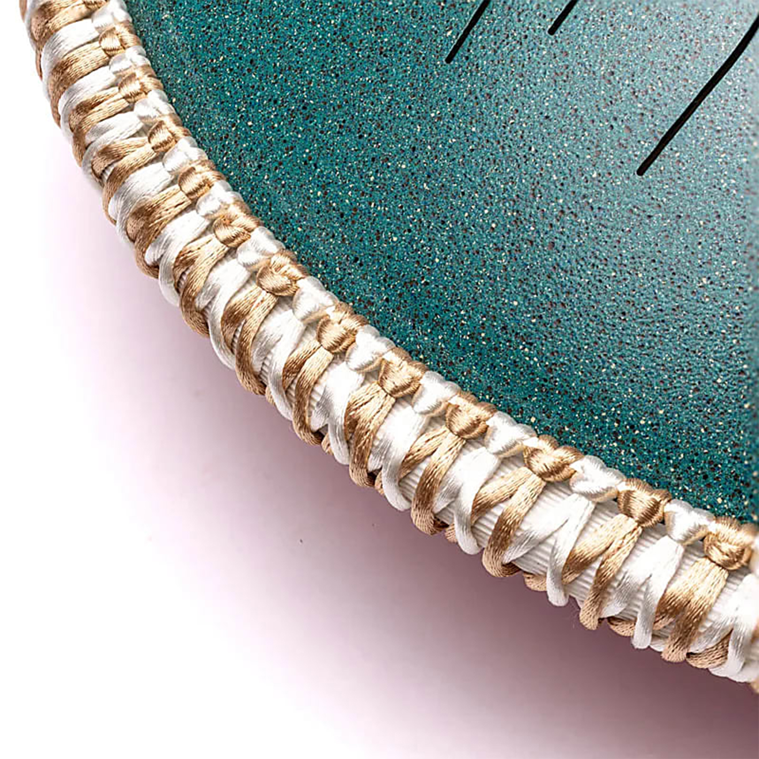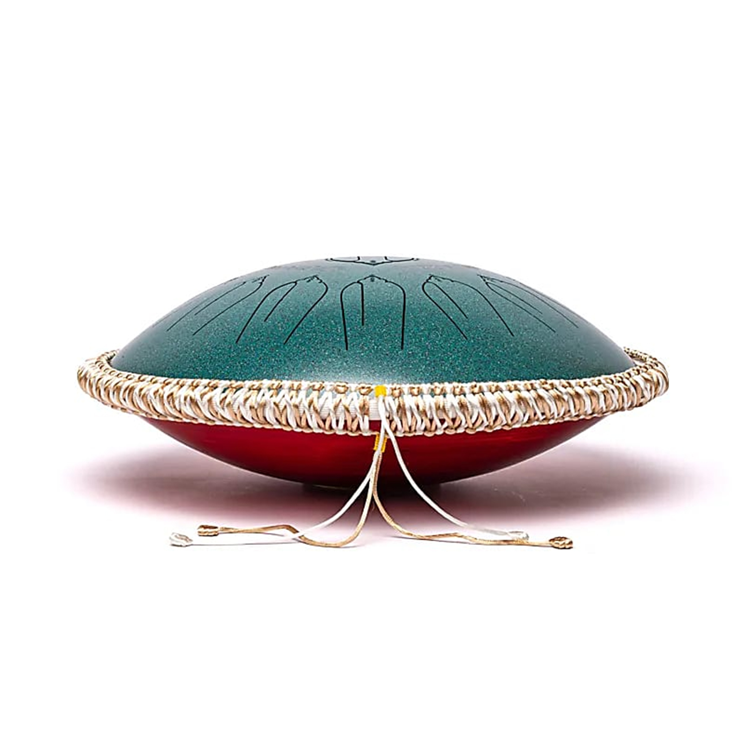 Diese 15‑tönige Hybrid-Trommel vereint die melodische Klarheit einer Tongue Drum mit der Tiefe und Projektion einer Handpan. Die Spielfläche aus Titanstahl, gehalten in lebendigem Türkis und verziert mit einem stilisierten Auszug aus dem Herzsutra, harmoniert mit dem tiefroten Birkenholzkorpus, der für einen warmen, resonanten Klangcharakter sorgt. Ein herausnehmbarer Holzstopfen an der Unterseite erlaubt das Erzeugen deutlicherer Obertöne. Ein integrierter piezoelektrischer Tonabnehmer ermöglicht zudem den Einsatz von Verstärkern und Effekten (Vorverstärker erforderlich).