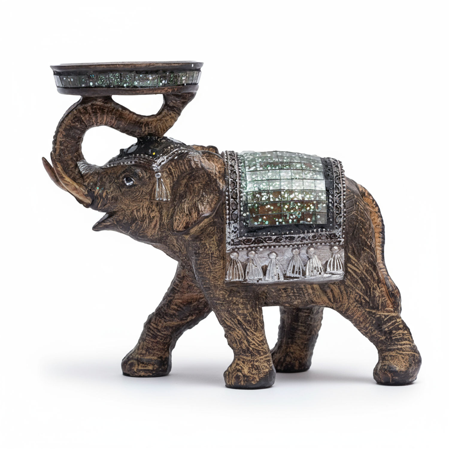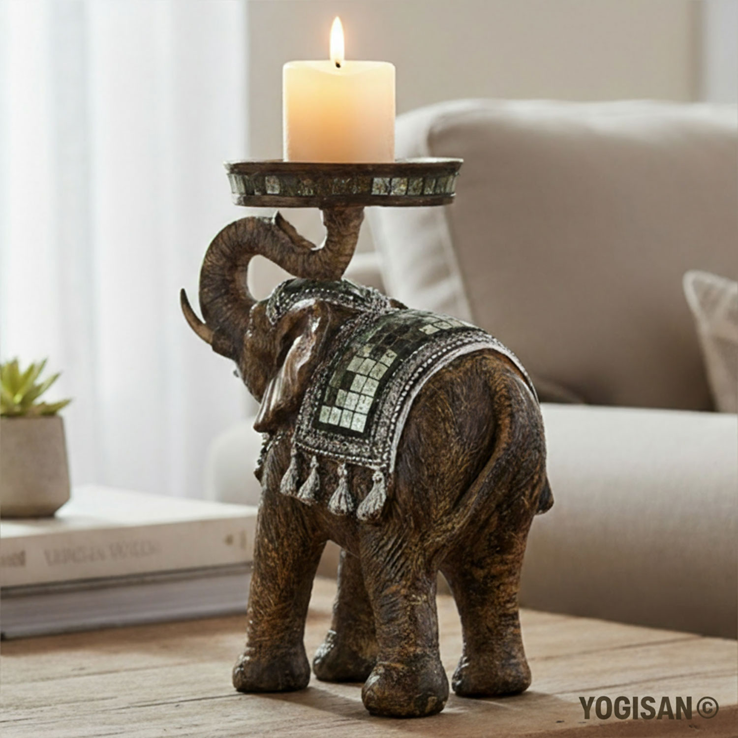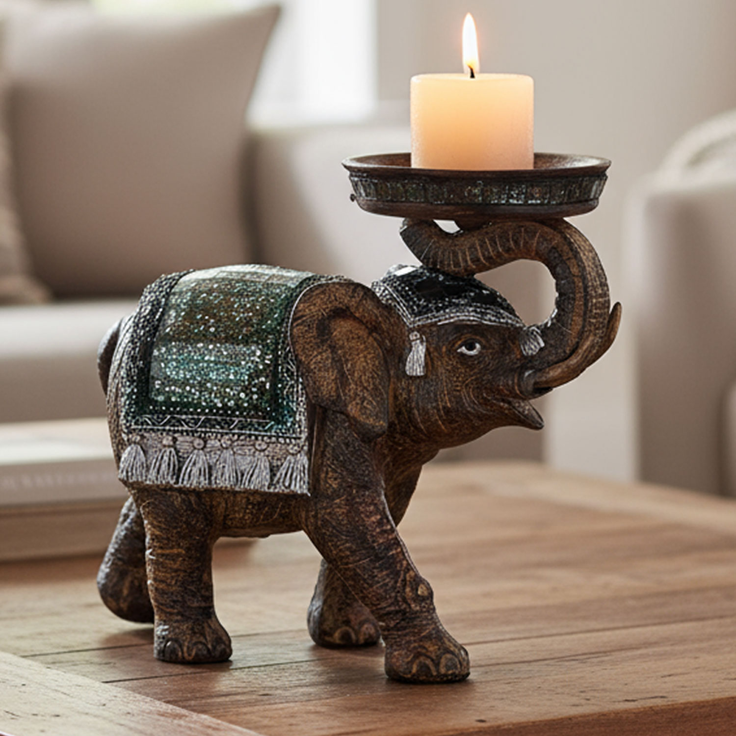 Ob auf dem Nachttisch, einem Regal oder als stilvoller Akzent auf dem Esstisch – der Indische Elefant mit Kerzenhalter fügt sich harmonisch in verschiedene Wohnkonzepte ein. Sein dezenter Glanz ergänzt sowohl moderne als auch klassische und boho-inspirierte Einrichtungsstile. Besonders gut kommt er in Kombination mit natürlichen Materialien wie Holz, Leinen oder Rattan zur Geltung. Auch im Eingangsbereich sorgt er für einen einladenden Akzent und heißt deine Gäste stilvoll willkommen. Das sanfte Kerzenlicht verleiht jedem Raum Ruhe und Wärme. Ganz gleich, ob minimalistisch oder opulent eingerichtet – dieser kleine Elefant schenkt jedem Zimmer eine entspannte Atmosphäre und einen Hauch Exotik.