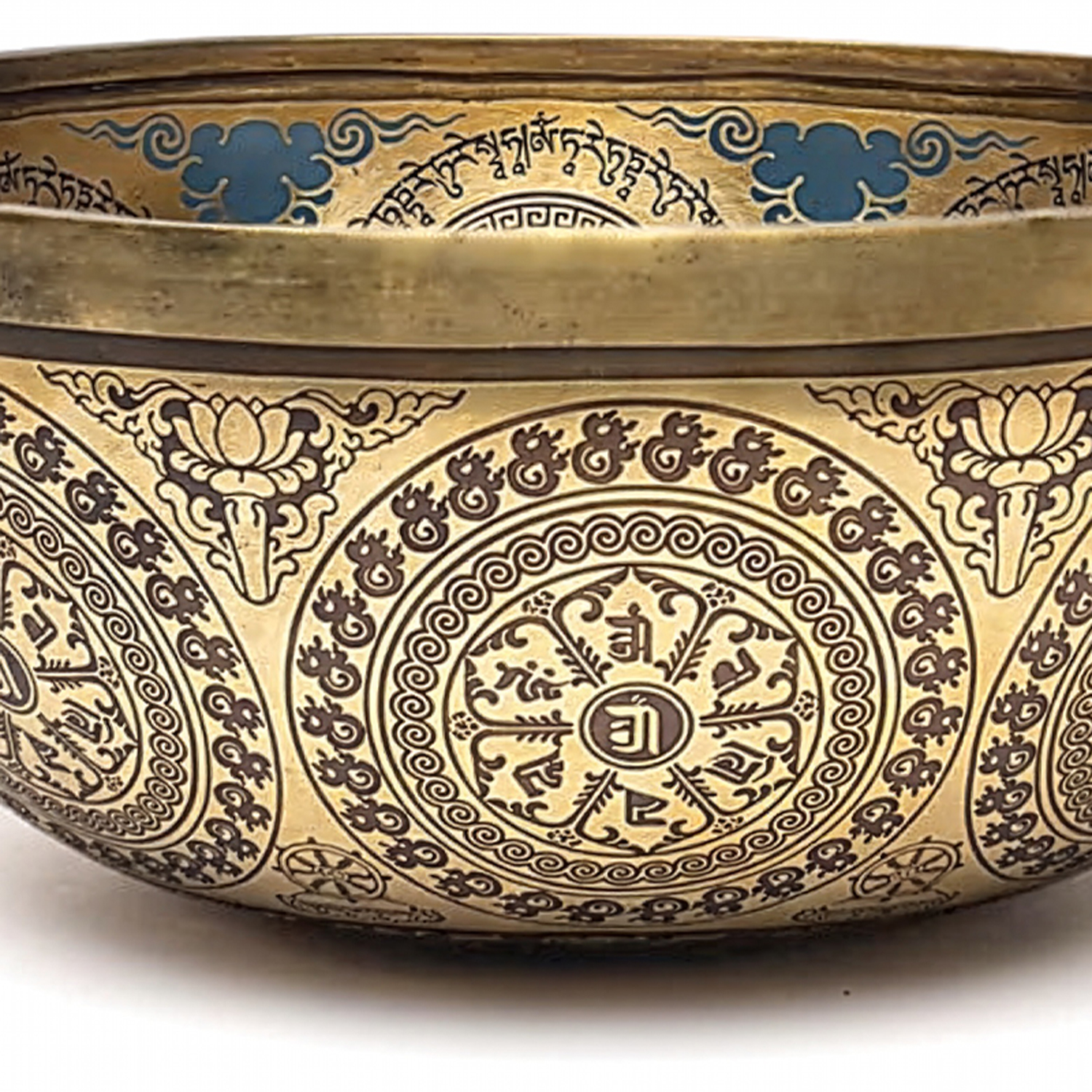Außen befinden sich Wolken- und Wellenmotive, Mantra-Felder und dekorative Bordüren. Auf der Unterseite liegen konzentrische Mantra-Ringe um eine stilisierte OM-Silbe.