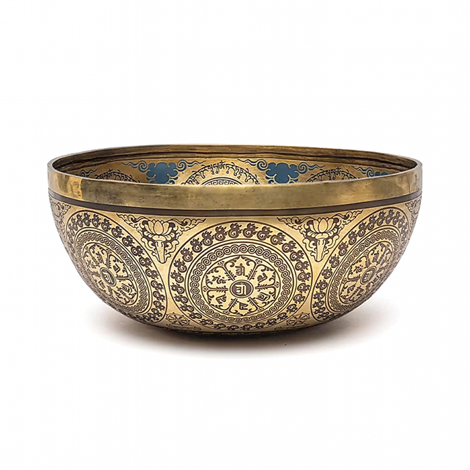 Die Schale besteht aus einer handgefertigten Bronzelegierung mit Spuren verschiedener Edelmetalle. Alle Motive werden lasergraviert und anschließend von Hand bemalt.