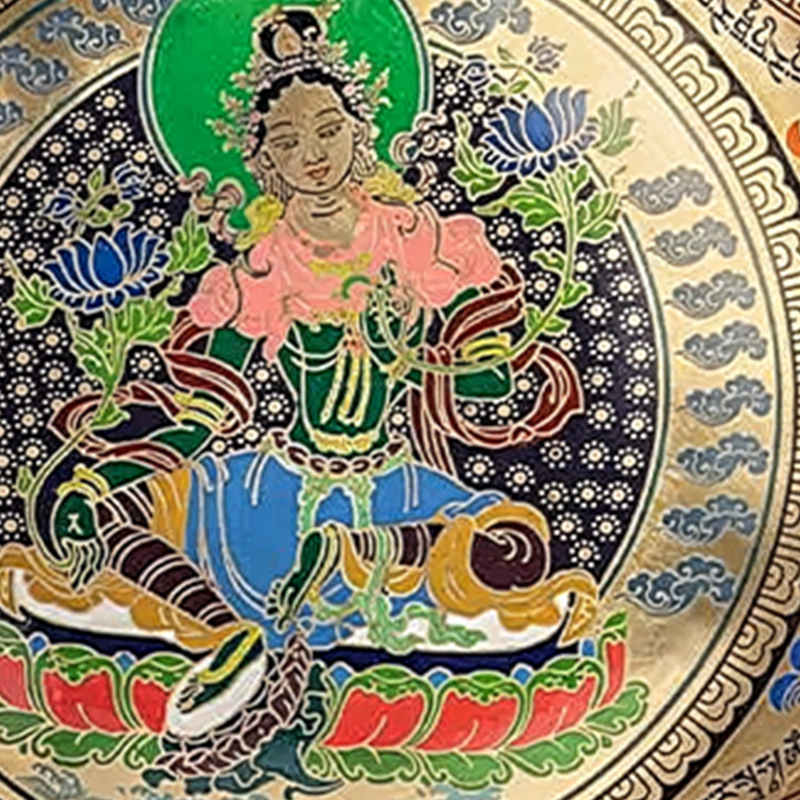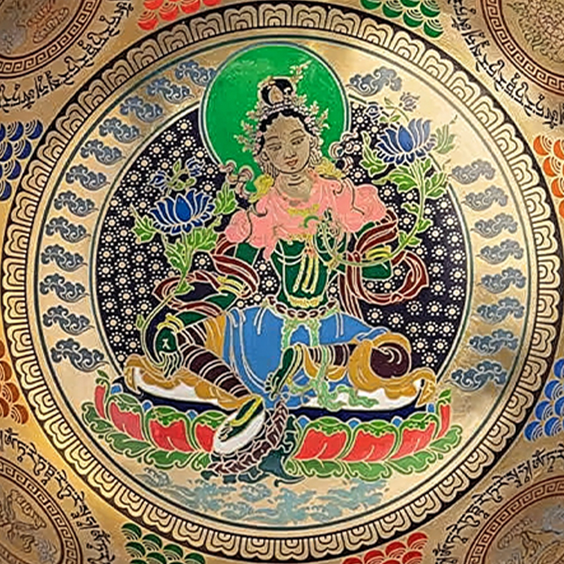 Diese Klangschale ist sorgfältig handbemalt und zeigt feine Linien sowie detailreiche Akzente. Das Motiv der Grünen Tara prägt das äußere Erscheinungsbild und verleiht der Schale eine markante Ausstrahlung. Jede Linie wurde einzeln aufgetragen, was die hochwertige Handarbeit sichtbar macht.