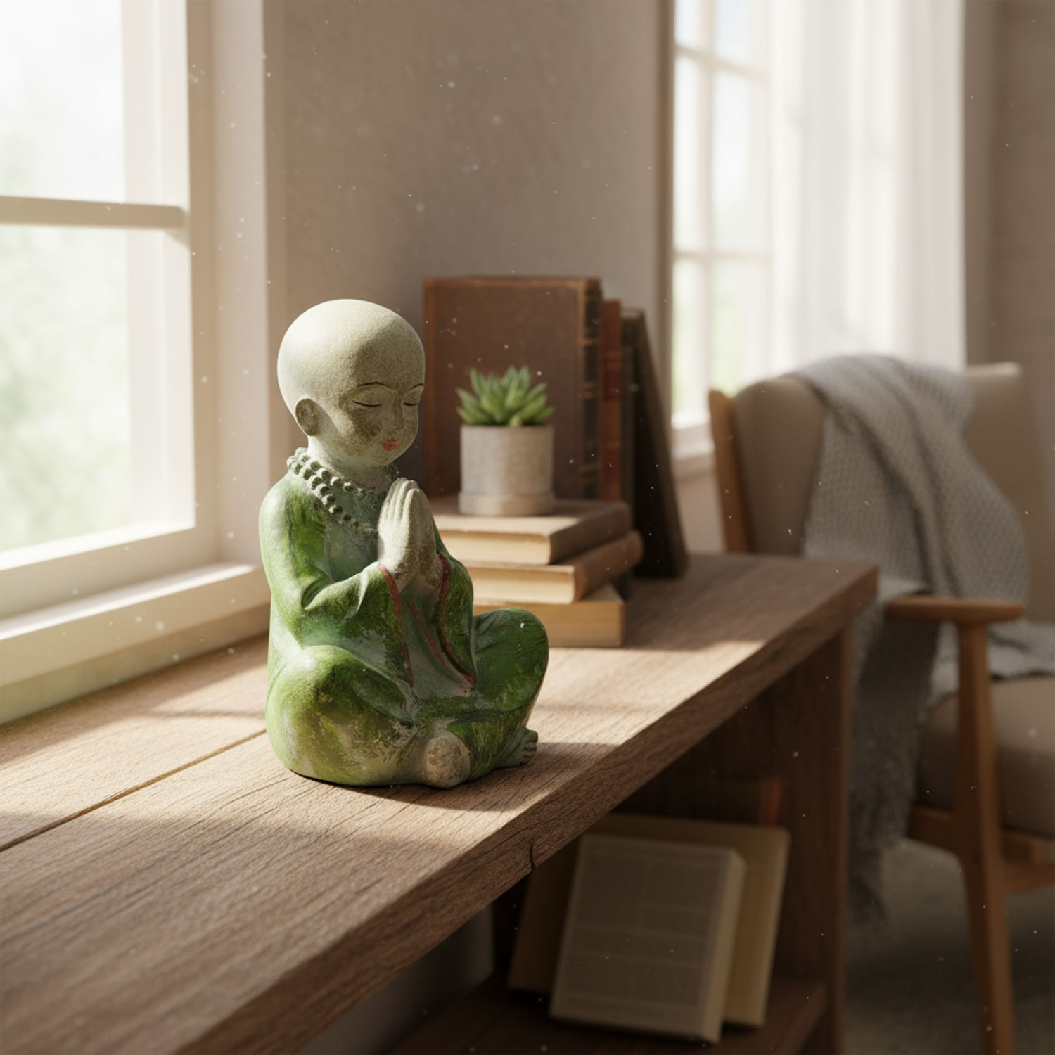 Eine Ecke deines Schreibtischs wirkt noch unvollständig. Du stellst den kleinen Mönch auf – sein sanftes Lächeln fängt sofort den Blick. Bei jedem hektischen Moment genügt ein kurzer Blick und ein tiefer Atemzug, um an Gelassenheit erinnert zu werden. So wird ein dekoratives Detail zum stillen Begleiter für mehr innere Ruhe.