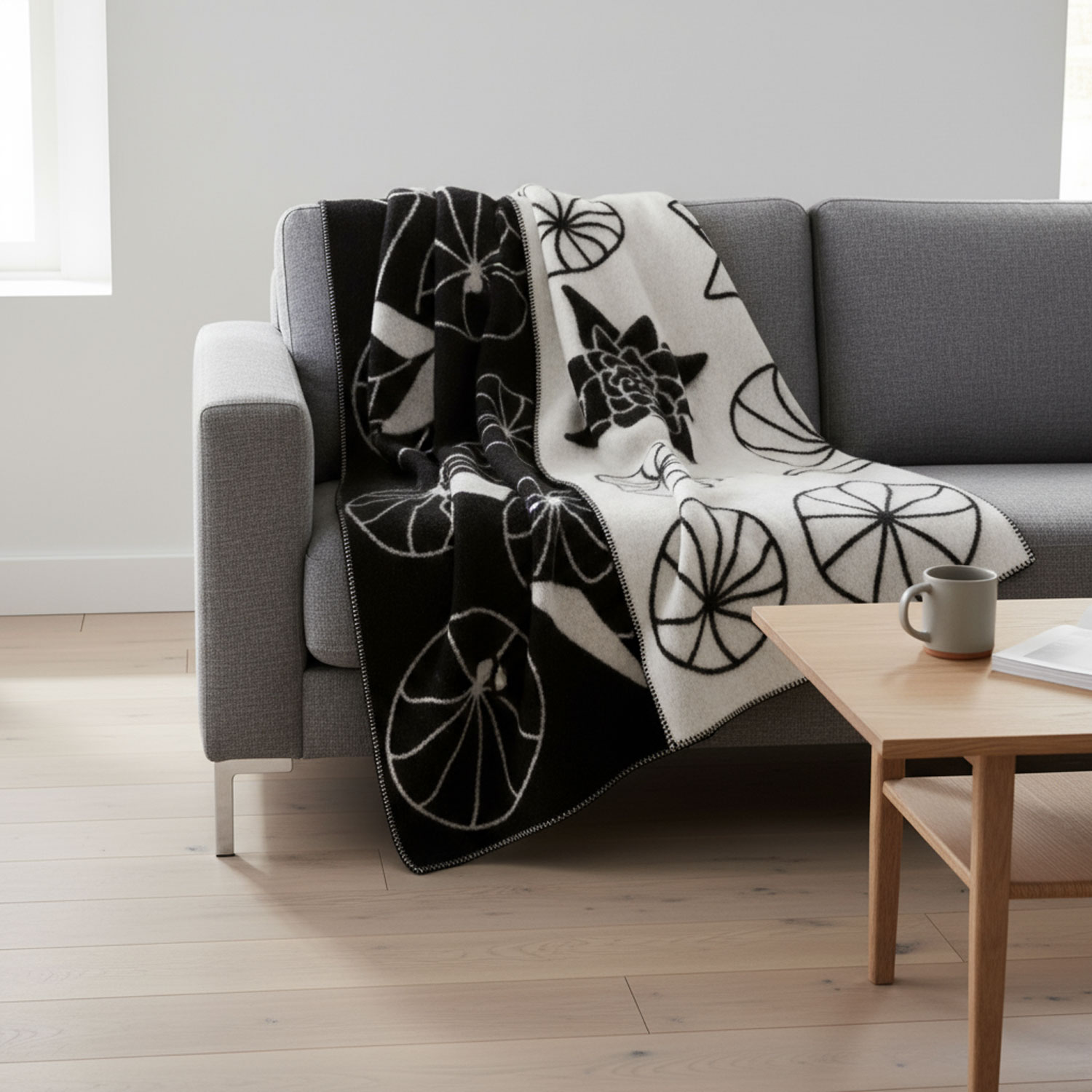 Die talentierte Grafikdesignerin Sophia Thurfjell absolvierte ihre Ausbildung an der renommierten Schule für Design und Kunsthandwerk in Göteborg. Ihre Inspiration findet sie in geschwungenen und geradlinigen Formen, wobei ihre Liebe zu Buchstaben in vielen ihrer Werke erkennbar ist. Mit dem zeitlosen Lotusblüten-Motiv dieser Decke hat sie ein wahres Meisterstück geschaffen, das Ästhetik und Funktionalität perfekt vereint.