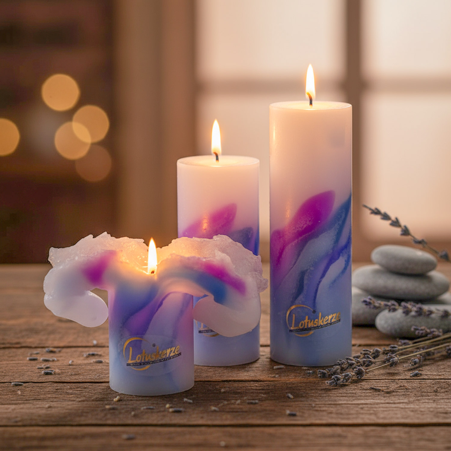Die flackernde Flamme der Lotuskerze Art Blue Passion 23cm x Ø 7cm erzeugt ein beruhigendes Licht. Ob auf der Couch oder im Bad – diese Kerze kann Deine Stimmung heben. Sie brennt gleichmäßig und zeigt ihre Lotusstruktur. Mit 23 cm Höhe brennt sie lange und ist ein treuer Begleiter.