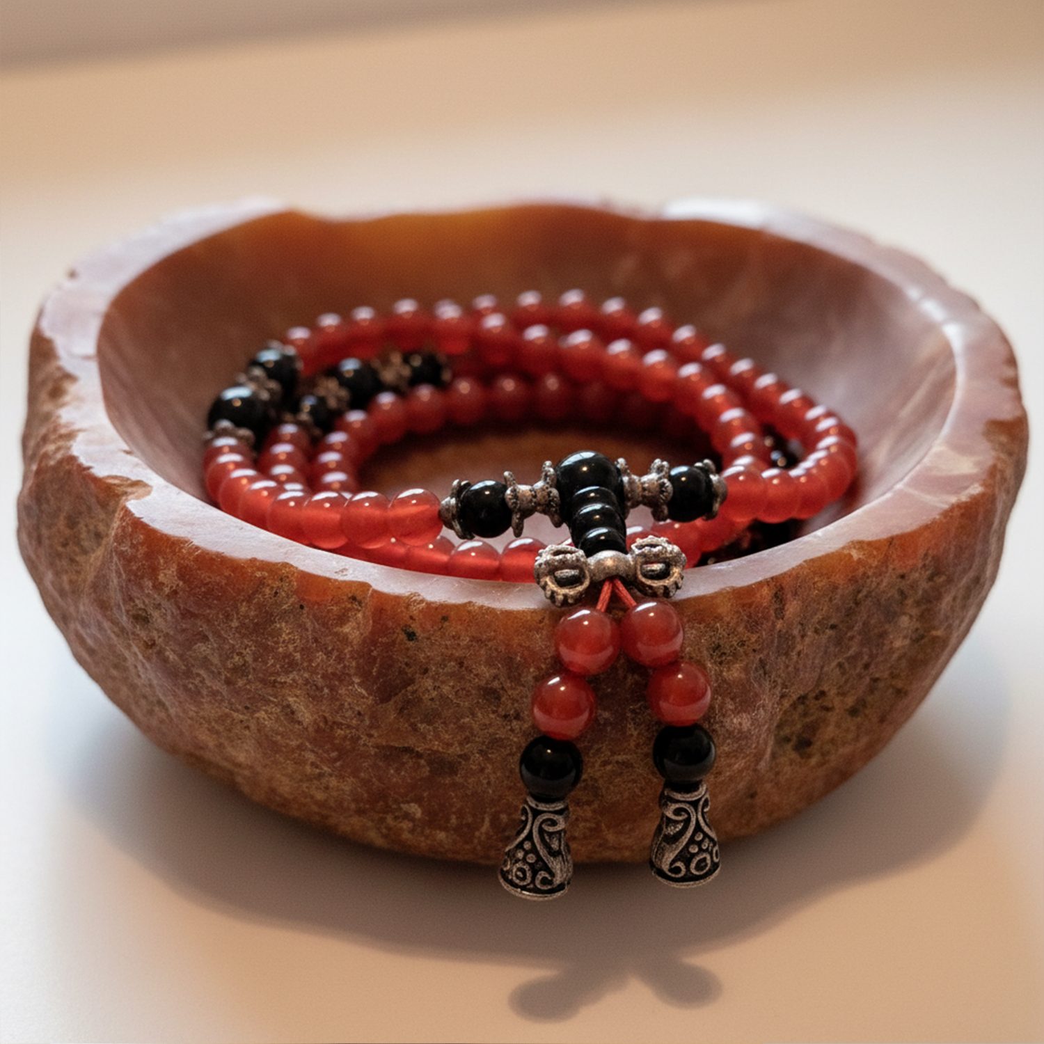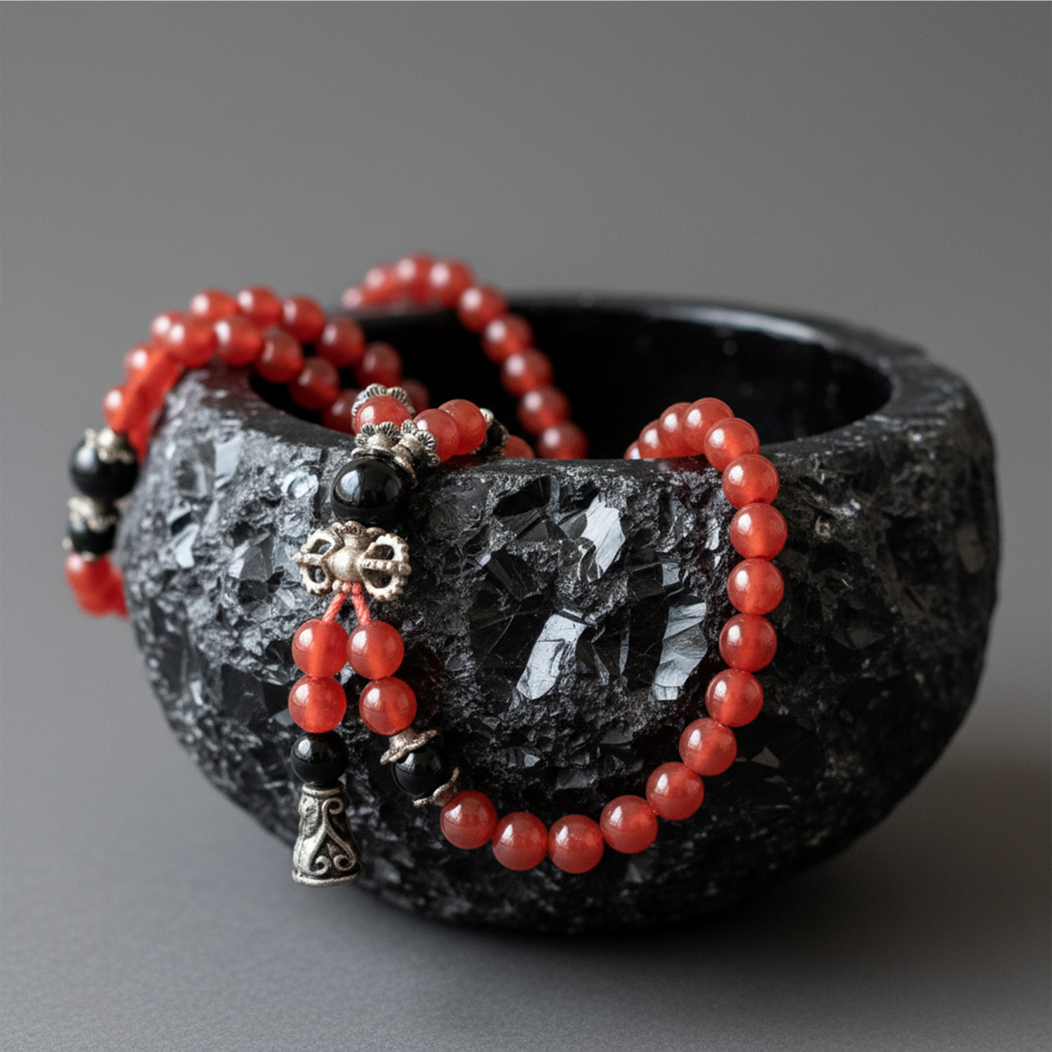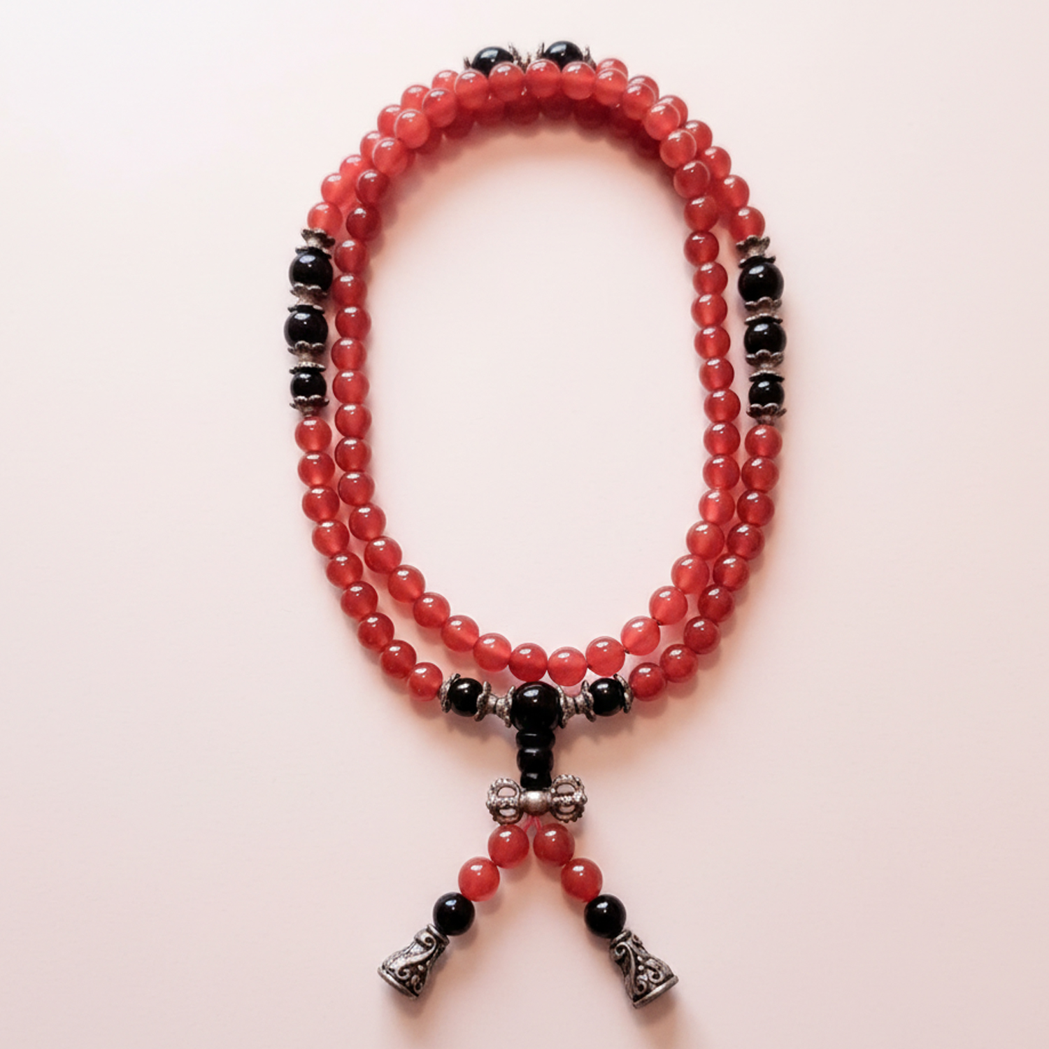 Mala-Gebetskette aus Karneol mit Obsidian und Dorje
