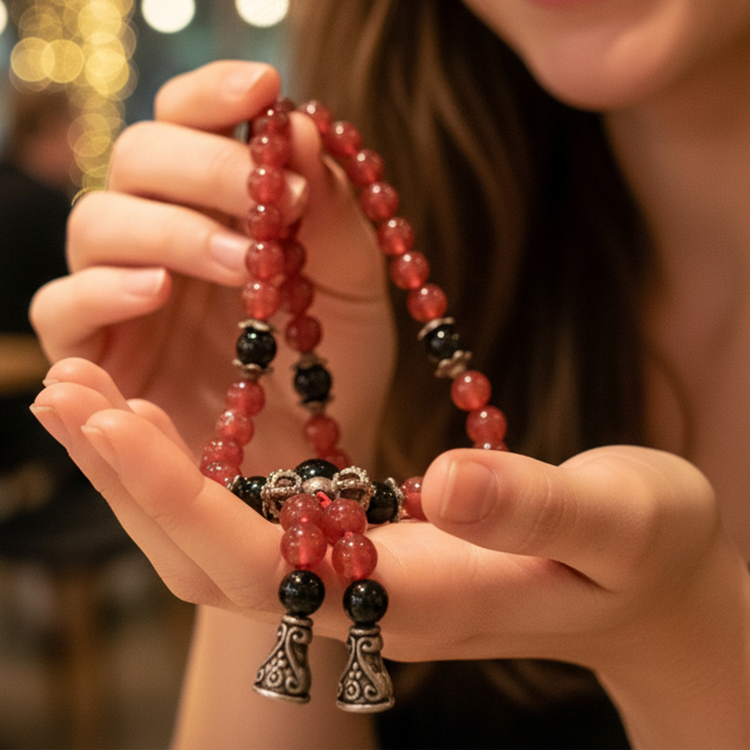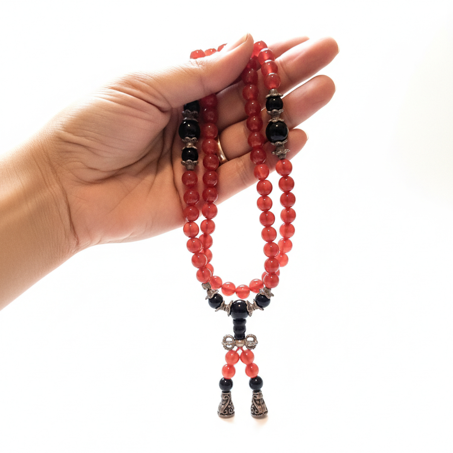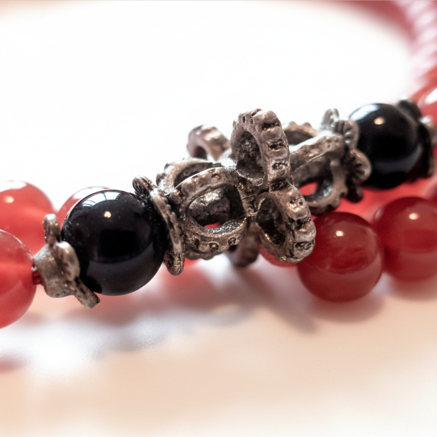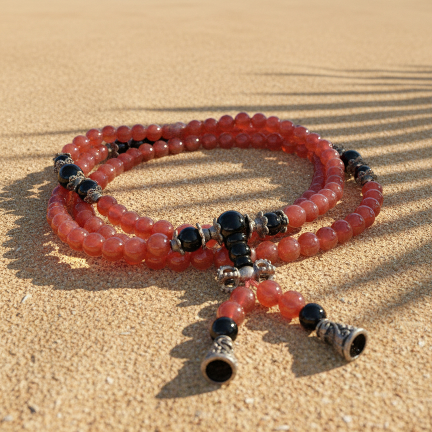 Mala-Gebetskette aus Karneol mit Obsidian und Dorje