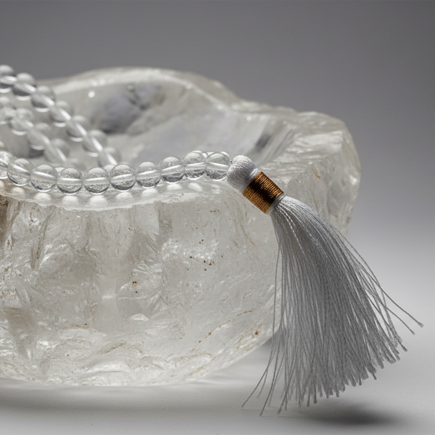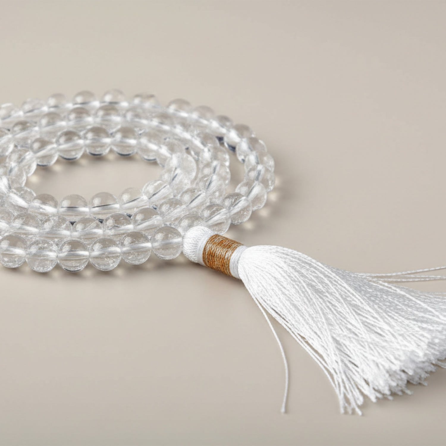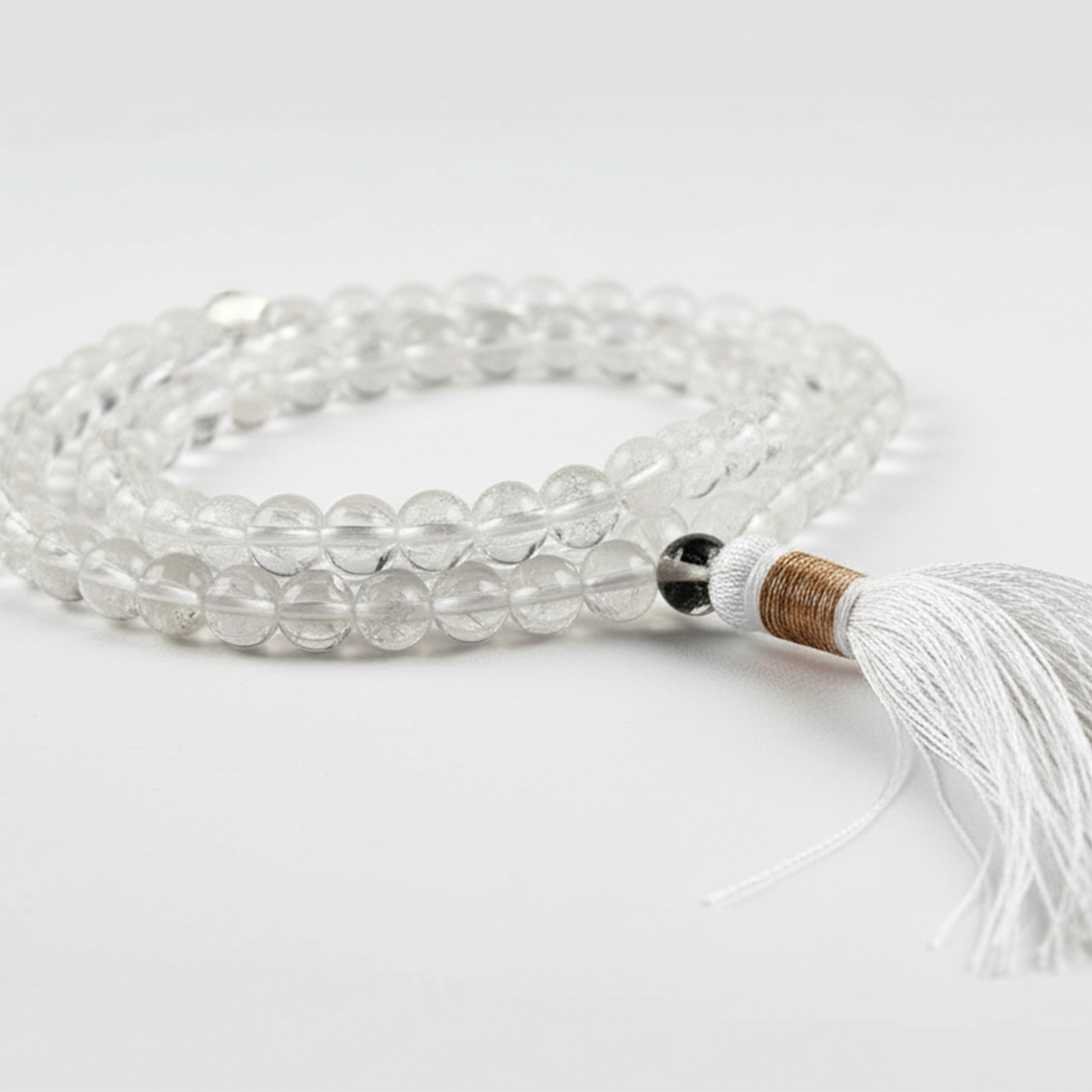 Bergkristall-Malas werden traditionell zum Rezitieren und Singen von Mantras verwendet. Ihre Funktion ähnelt der eines Rosenkranzes, doch ihr Ursprung liegt in der buddhistischen und hinduistischen Praxis. Die Perlen bestehen häufig aus Edelsteinen, Bodhisamen, Holz oder Perlmutt und eignen sich zum Zählen von Mantras, Atemzügen oder Gebeten. Eine hochwertige Mala besteht aus neun miteinander verflochtenen Fäden, die Buddha Vajradhara und die acht Bodhisattvas symbolisieren. Die große Abschlussperle steht für Weisheit, während die darüber liegende zylindrische Perle die Leere verkörpert – gemeinsam symbolisieren sie das Überwinden geistiger Hindernisse.