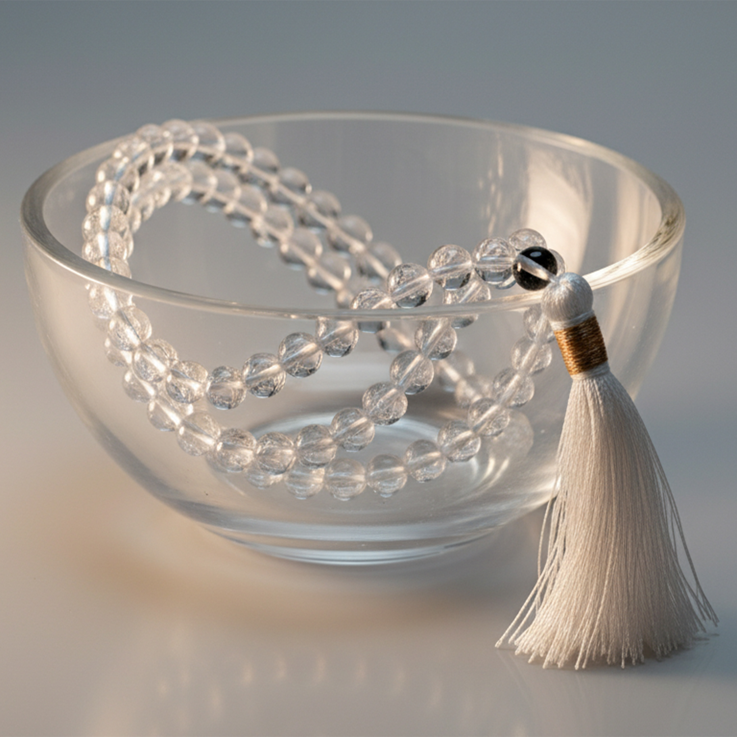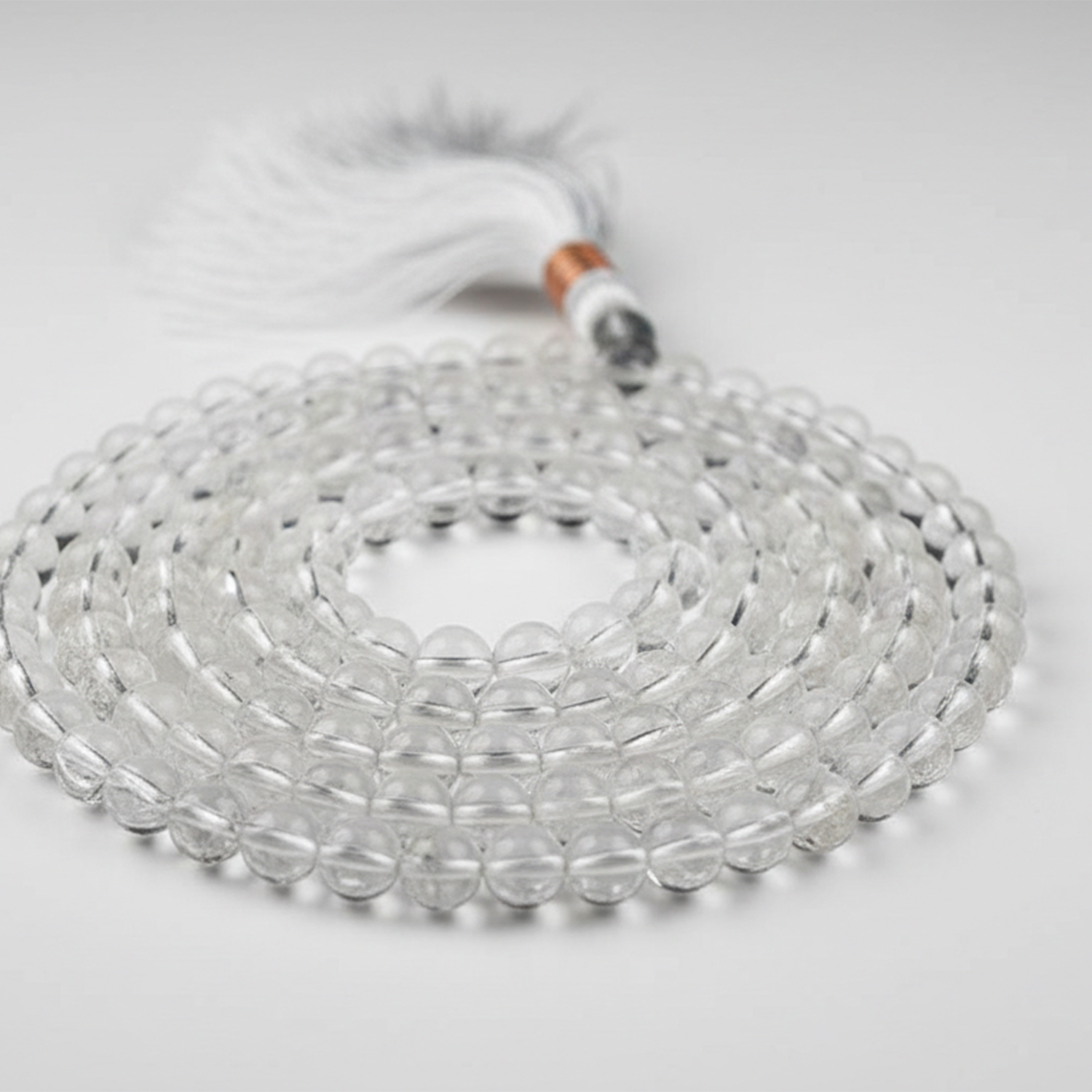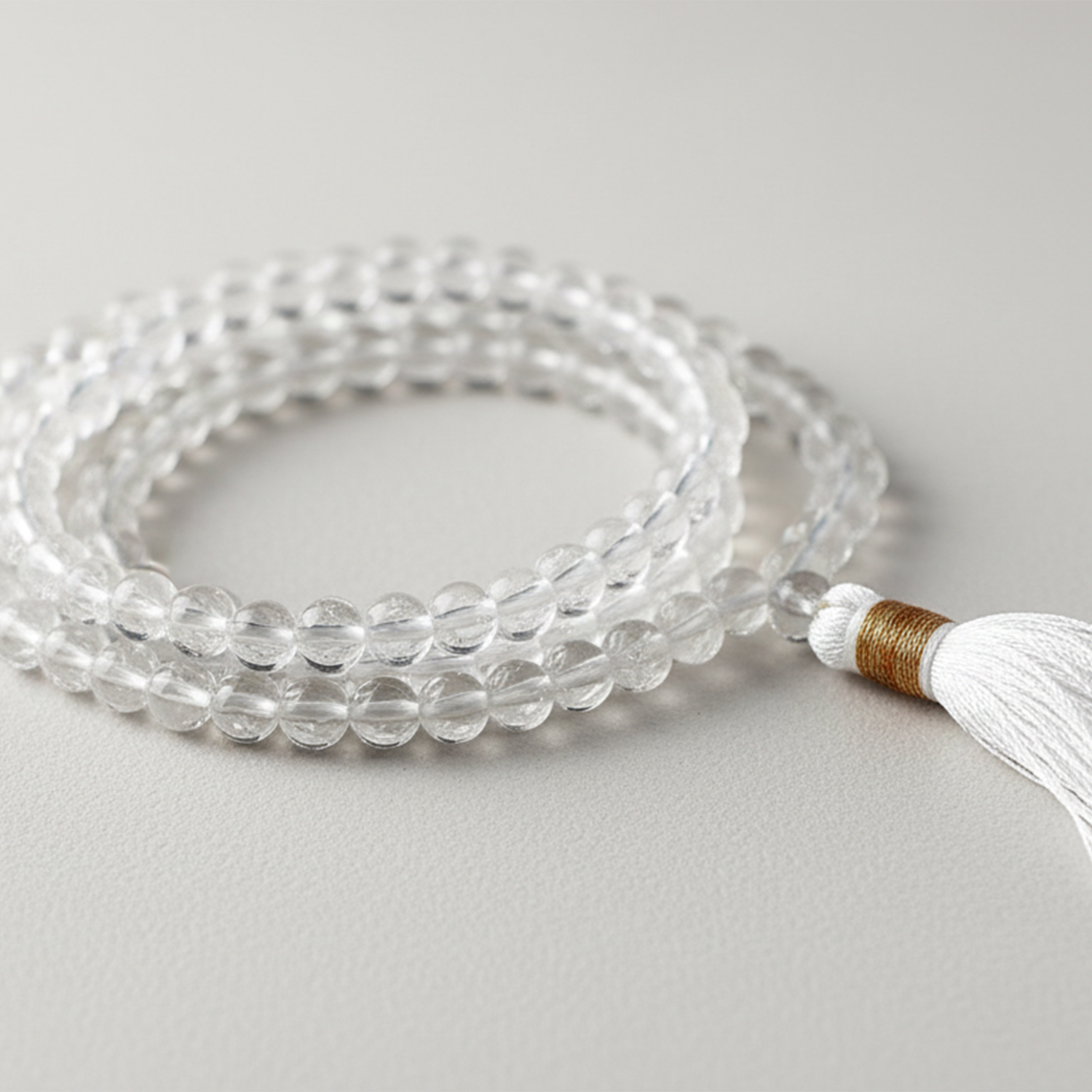 Bergkristall-Malas werden traditionell zum Rezitieren und Singen von Mantras verwendet. Ihre Funktion ähnelt der eines Rosenkranzes, doch ihr Ursprung liegt in der buddhistischen und hinduistischen Praxis. Die Perlen bestehen häufig aus Edelsteinen, Bodhisamen, Holz oder Perlmutt und eignen sich zum Zählen von Mantras, Atemzügen oder Gebeten. Eine hochwertige Mala besteht aus neun miteinander verflochtenen Fäden, die Buddha Vajradhara und die acht Bodhisattvas symbolisieren. Die große Abschlussperle steht für Weisheit, während die darüber liegende zylindrische Perle die Leere verkörpert – gemeinsam symbolisieren sie das Überwinden geistiger Hindernisse.