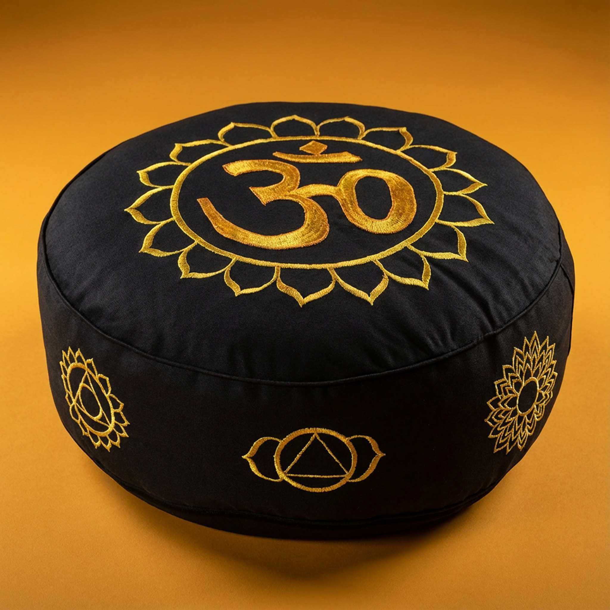 Ob stille Meditation oder Atemarbeit – die kompakte Sitzhöhe entlastet Hüfte & Rücken. Das dezente Schwarz mit goldener Stickerei wirkt ruhig und wertig – im Studio wie zu Hause.