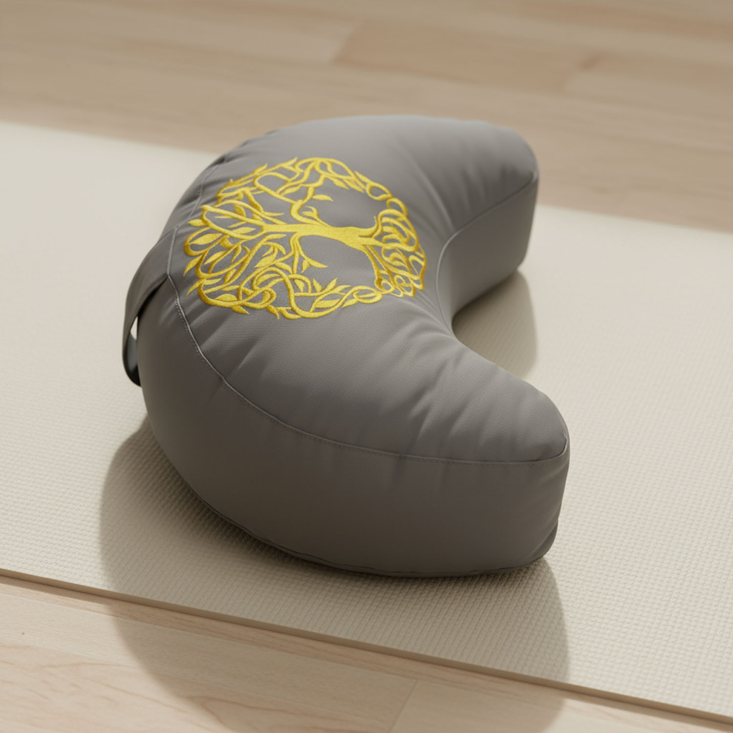 Die Halbmondform lässt an den Hüften bewusst Platz, während die leicht erhöhte Sitzkante Becken und Rücken stabilisiert. So findest du schneller eine aufrechte, entspannte Meditationshaltung – im Schneider- oder Lotussitz ebenso wie in knieschonenden Variationen.