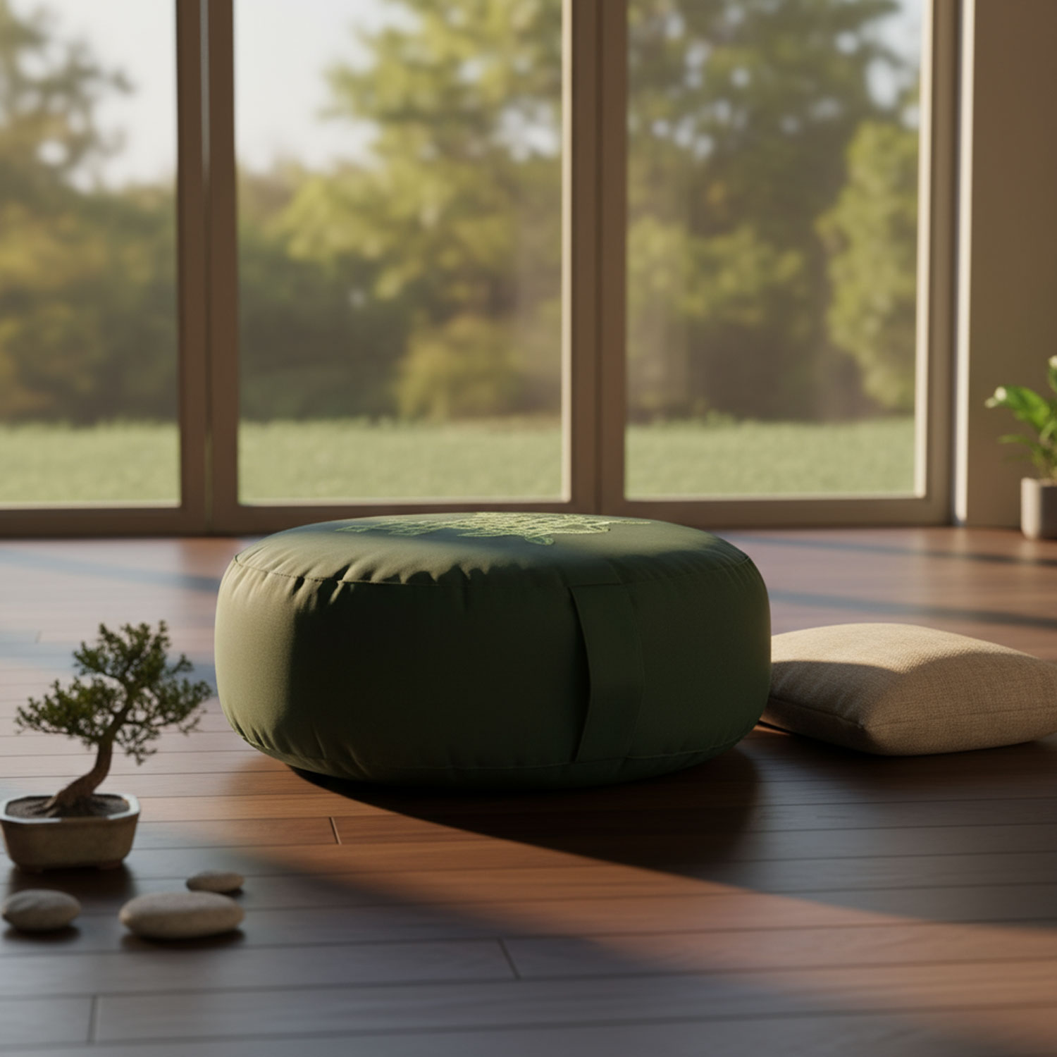 Das Meditationskissen Baum des Lebens ist etwa 17 Zentimetern hoch und verfügt über einen roten oder grünen Bezug aus reiner Baumwolle. Als Füllmittel verwenden wir mehrfach entstaubte Dinkelspelzen oder Buchweizenschalen.