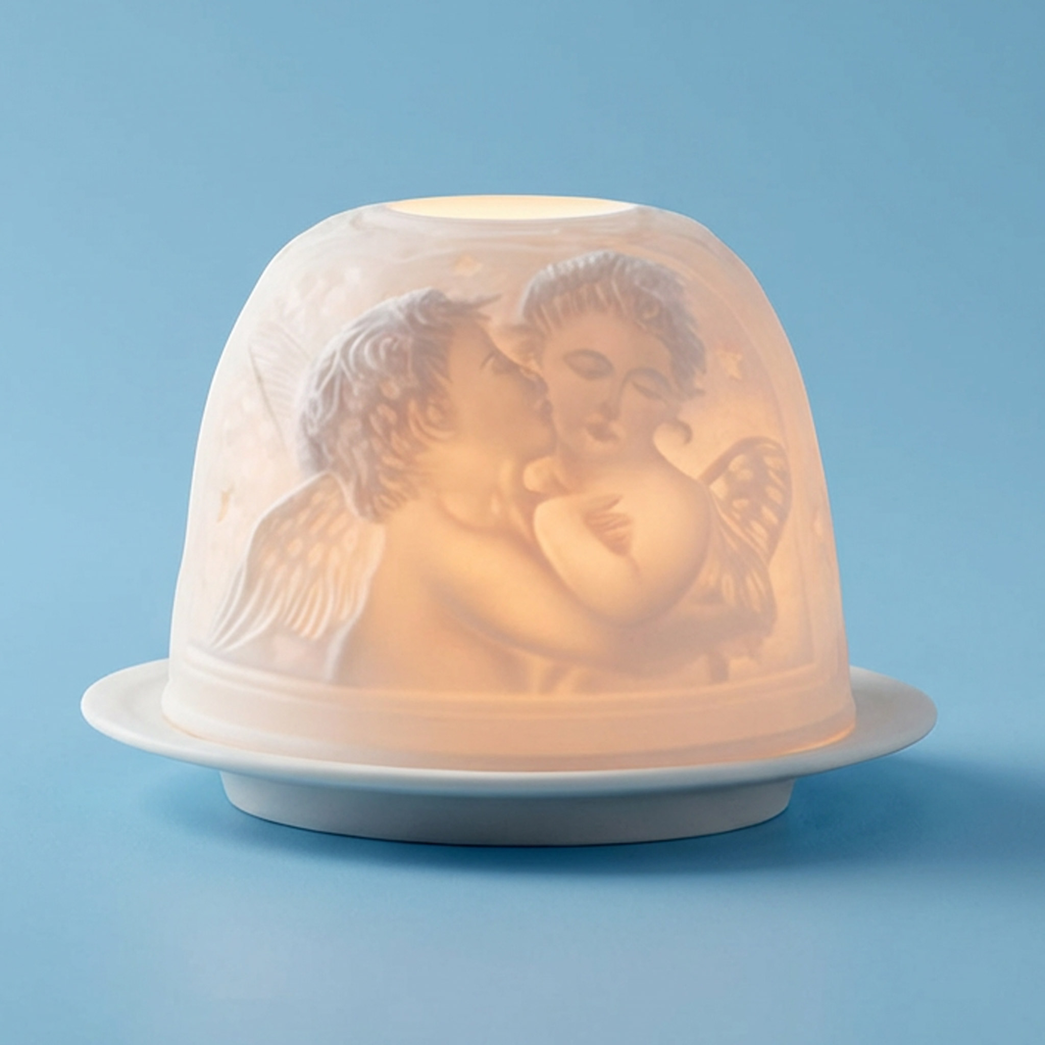 Wenn du das Teelicht anzündest, zeigt sich der besondere Effekt: Das warme Licht scheint durch das feine Porzellan und lässt das Engelsmotiv leuchten. So entsteht ein angenehmes Lichtspiel, das den Raum mit sanftem Licht erfüllt.