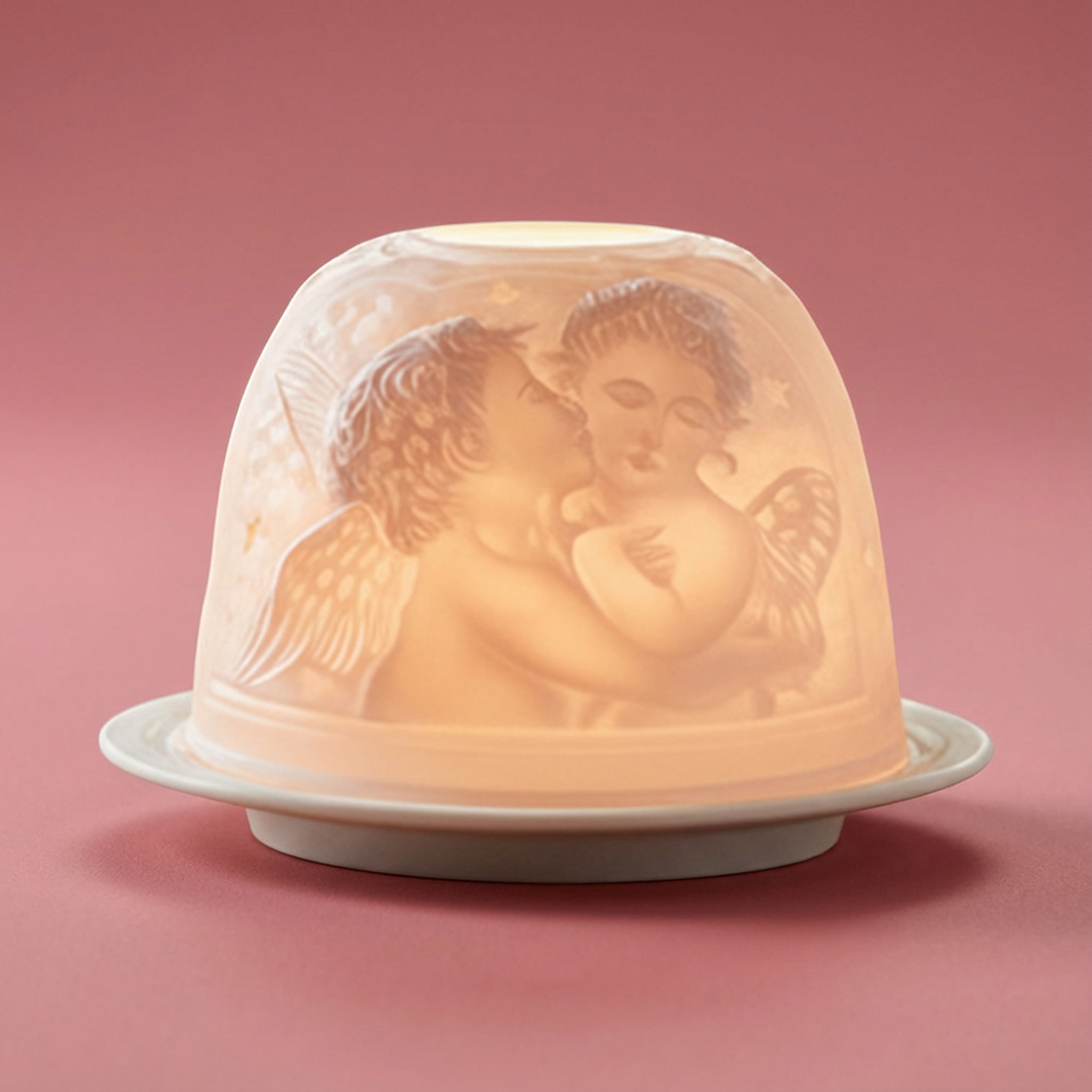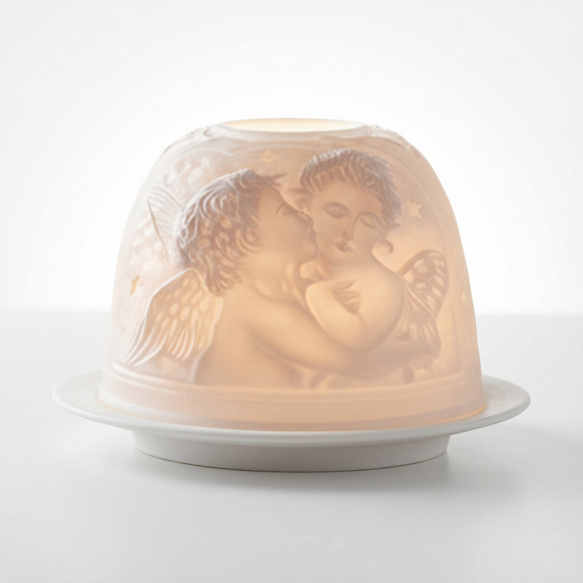 Die Flamme des Teelichts wirft schöne Schatten und Lichtreflexe, die dem Engel Leben einhauchen. Das Licht bewegt sich sanft über das Porzellan und hebt die feinen Details des Motivs hervor.