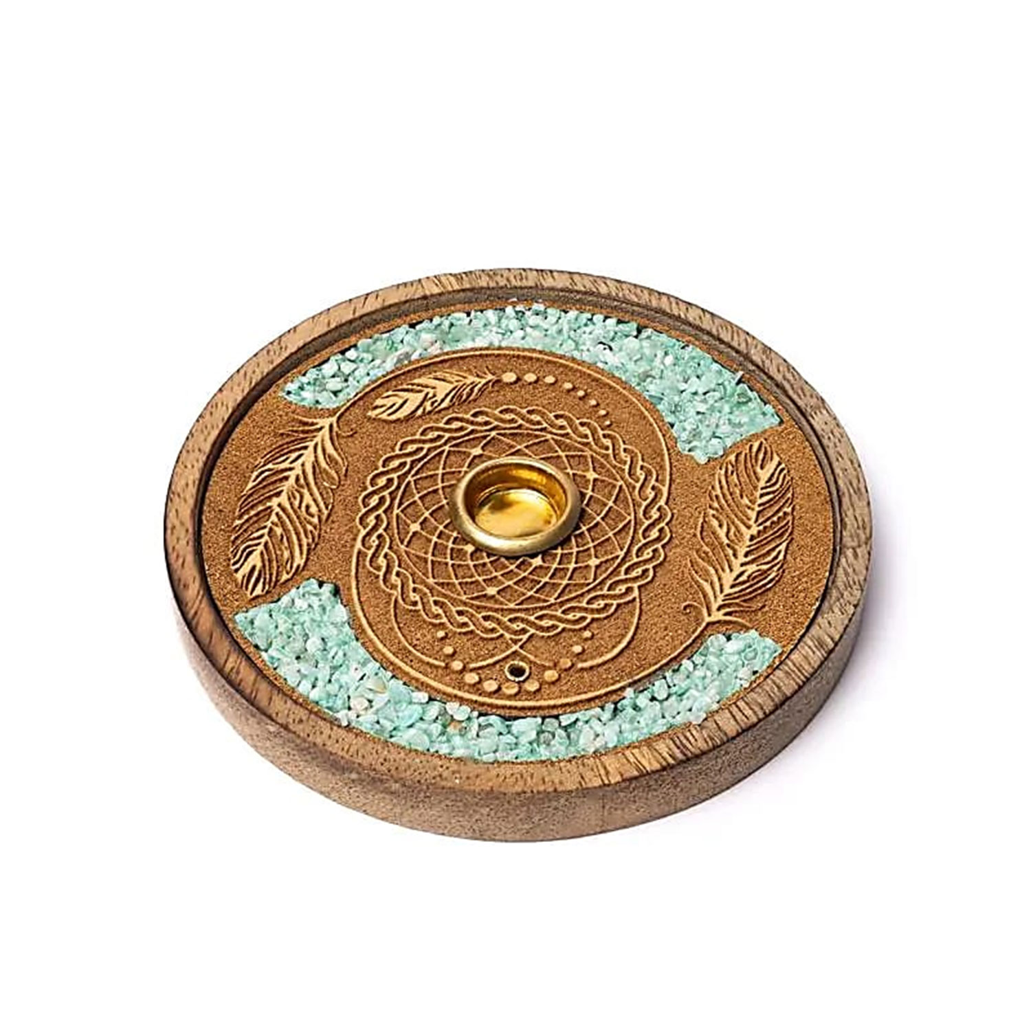Der Räucherstäbchen- und Kegelhalter Traumfänger besteht aus sorgfältig verarbeitetem Mango-Holz und geschliffenen Amazonit-Steinen, die traditionell für ihre beruhigende, stärkende und schützende Wirkung geschätzt werden. Der Halter bietet eine sichere Ablage für Räucherstäbchen und Räucherkegel und gewährleistet einen stabilen Stand während des Abbrandes. Der sanfte, natürliche Glanz des Amazonits verleiht dem Halter eine harmonische und warme Ausstrahlung, die sich mühelos in verschiedenste Wohn- und Wohlfühlbereiche einfügt.