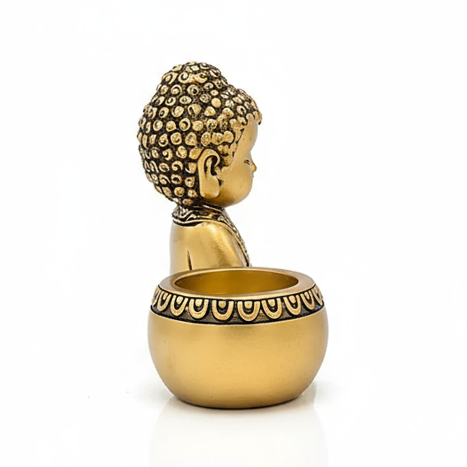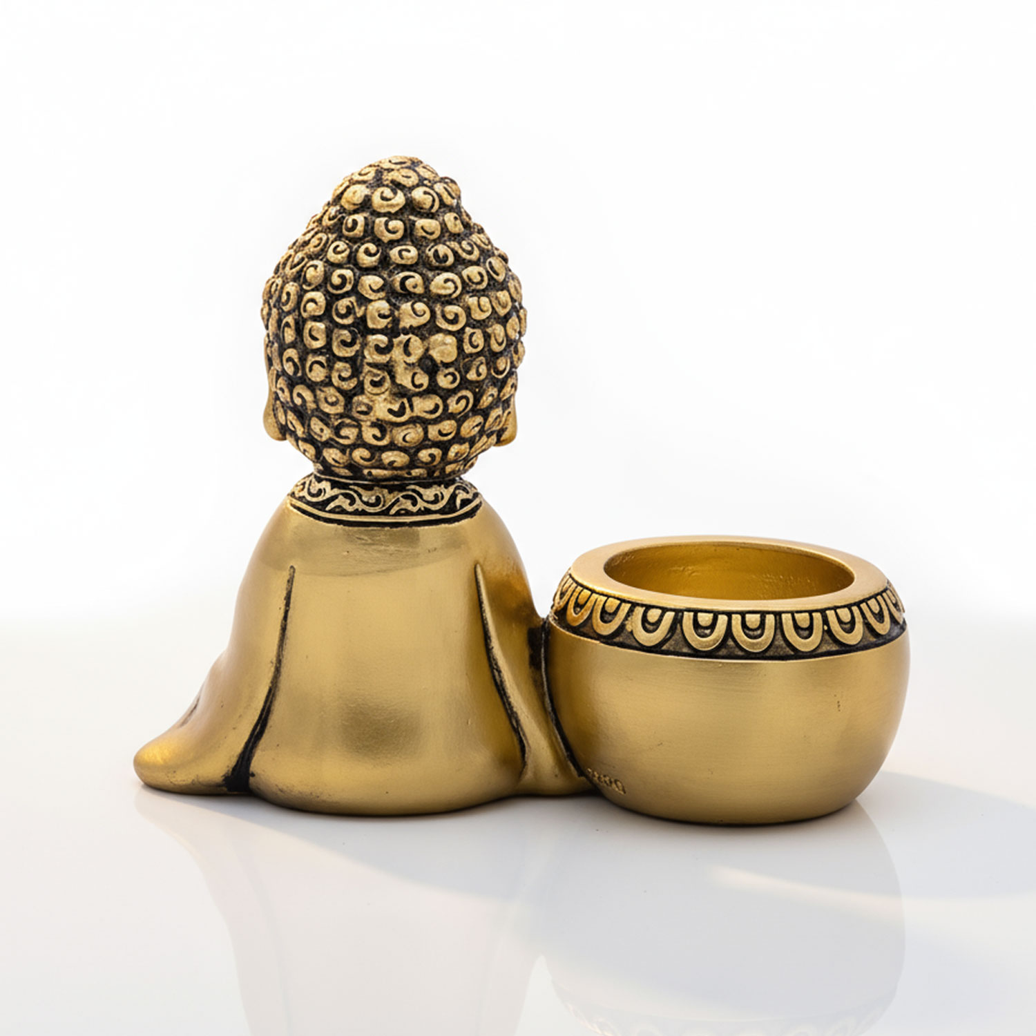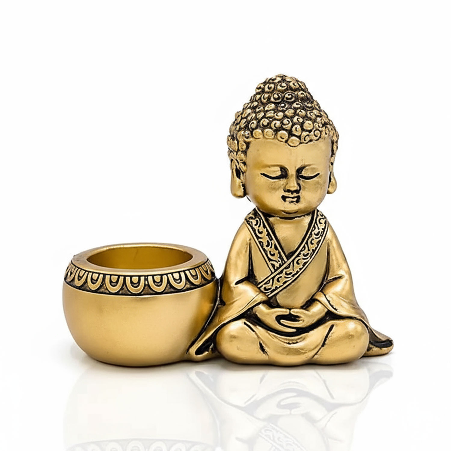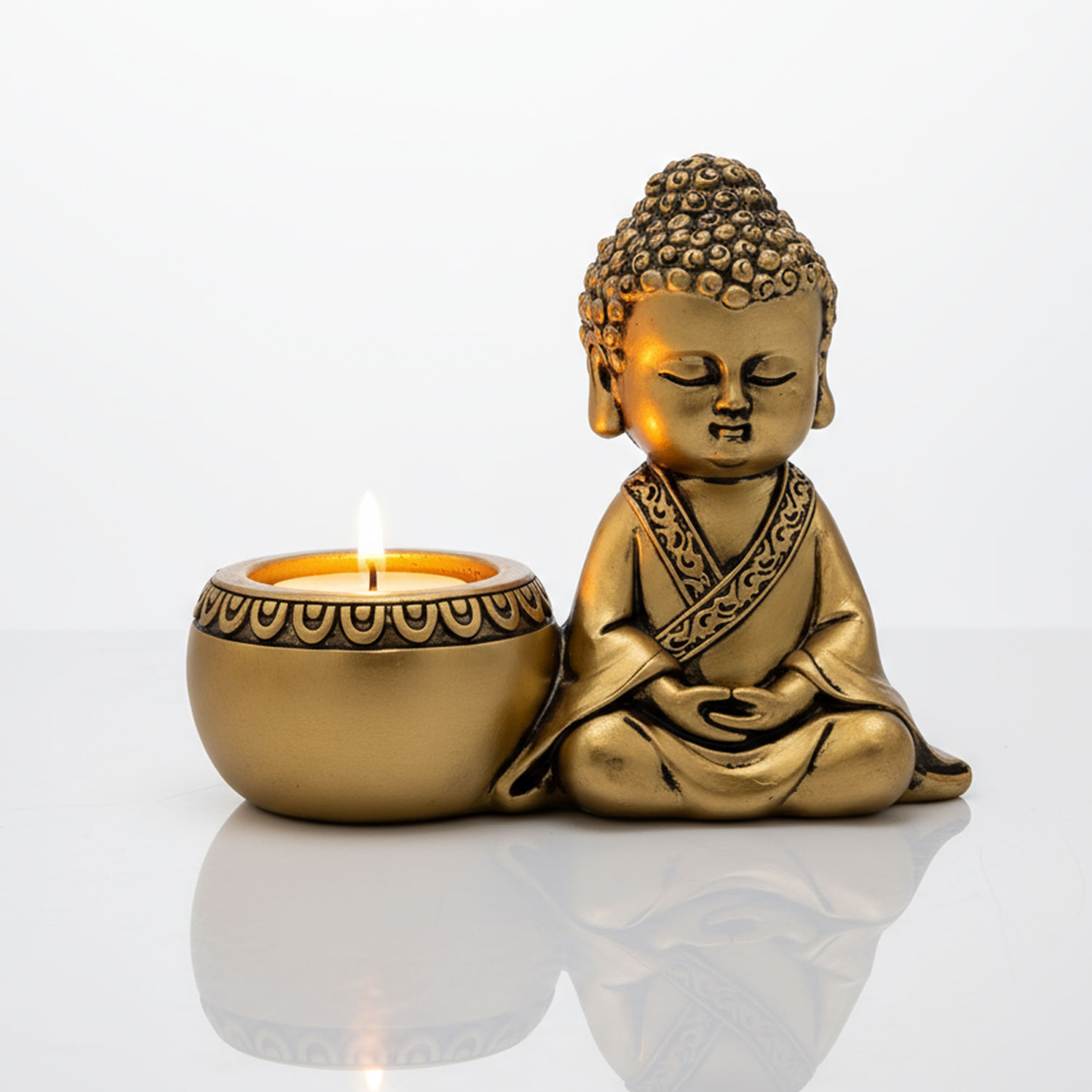 Edler, kompakter Kerzenhalter mit meditierender Buddha-Figur. Schafft sofort eine ruhige, warme Atmosphäre – ideal für Meditation, Yoga-Ecke und stilvolles Wohnambiente.