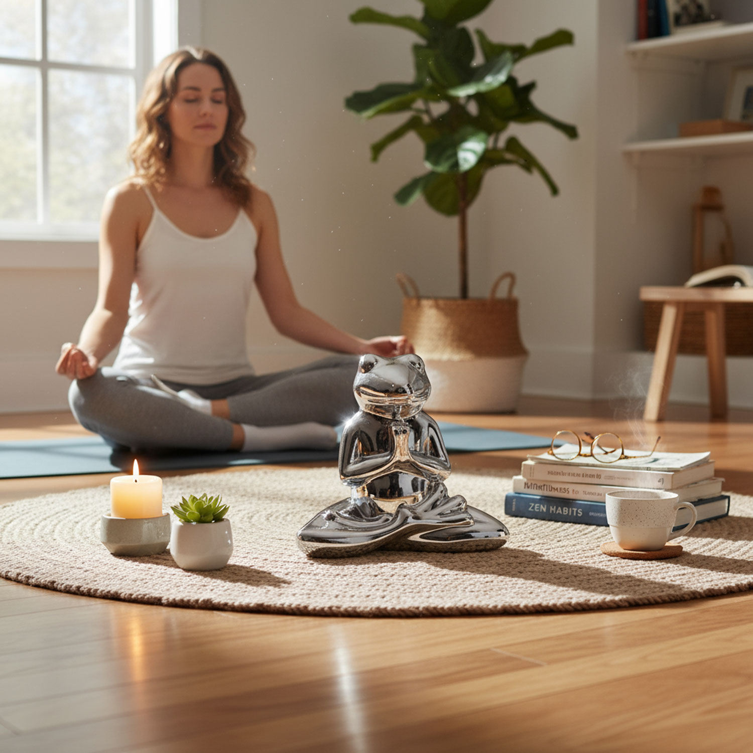 Mit der Buddha Yoga Frosch Zen-Meditation Skulptur kannst du diese Qualitäten in deinem Zuhause oder Büro präsentieren und dich von ihrem
