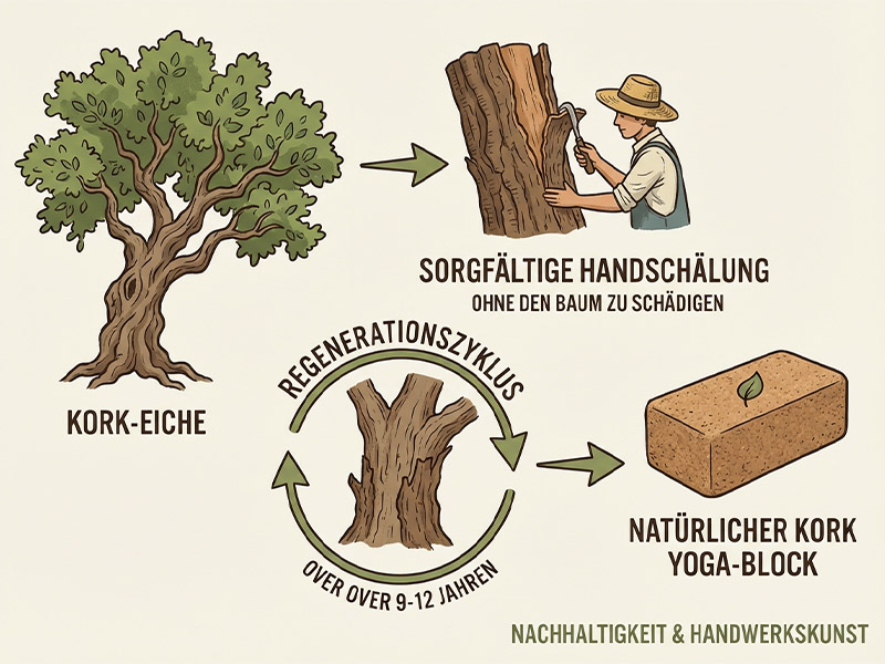 Die Rinde der Korkeiche wird etwa alle neun Jahre geerntet – ein Vorgang, der dem Baum nicht schadet, sondern ihn sogar dazu anregt, mehr CO2 zu binden. Eine einzelne Korkeiche kann bis zu 200 Jahre und älter werden und liefert während ihres Lebens immer wieder wertvollen Kork. Die Korkernte ist eine traditionelle Handwerkskunst, die seit Jahrhunderten praktiziert wird und den Bäumen keinen Schaden zufügt. Entdecke auch unsere Kork Yogamatten Premium, die ebenso von diesem einzigartigen Material profitieren.