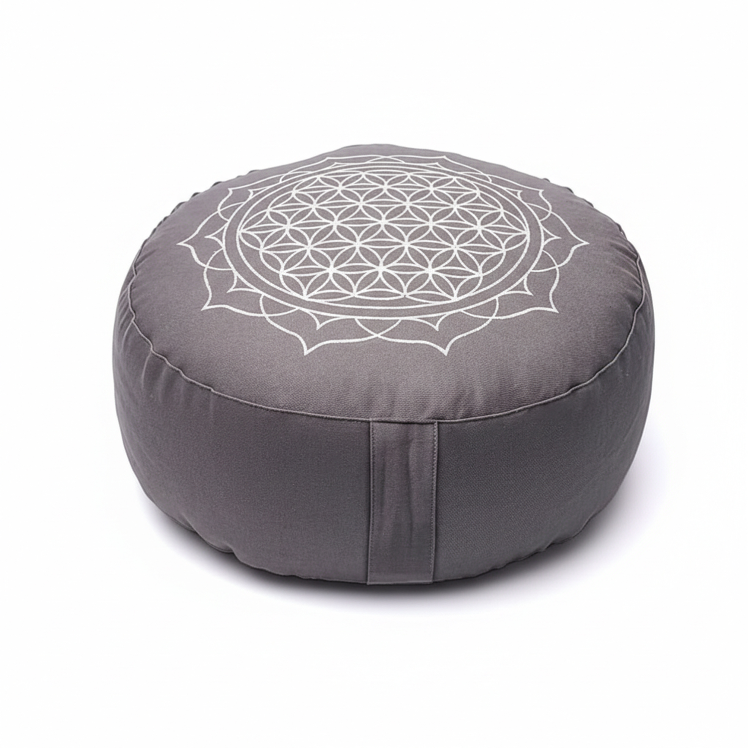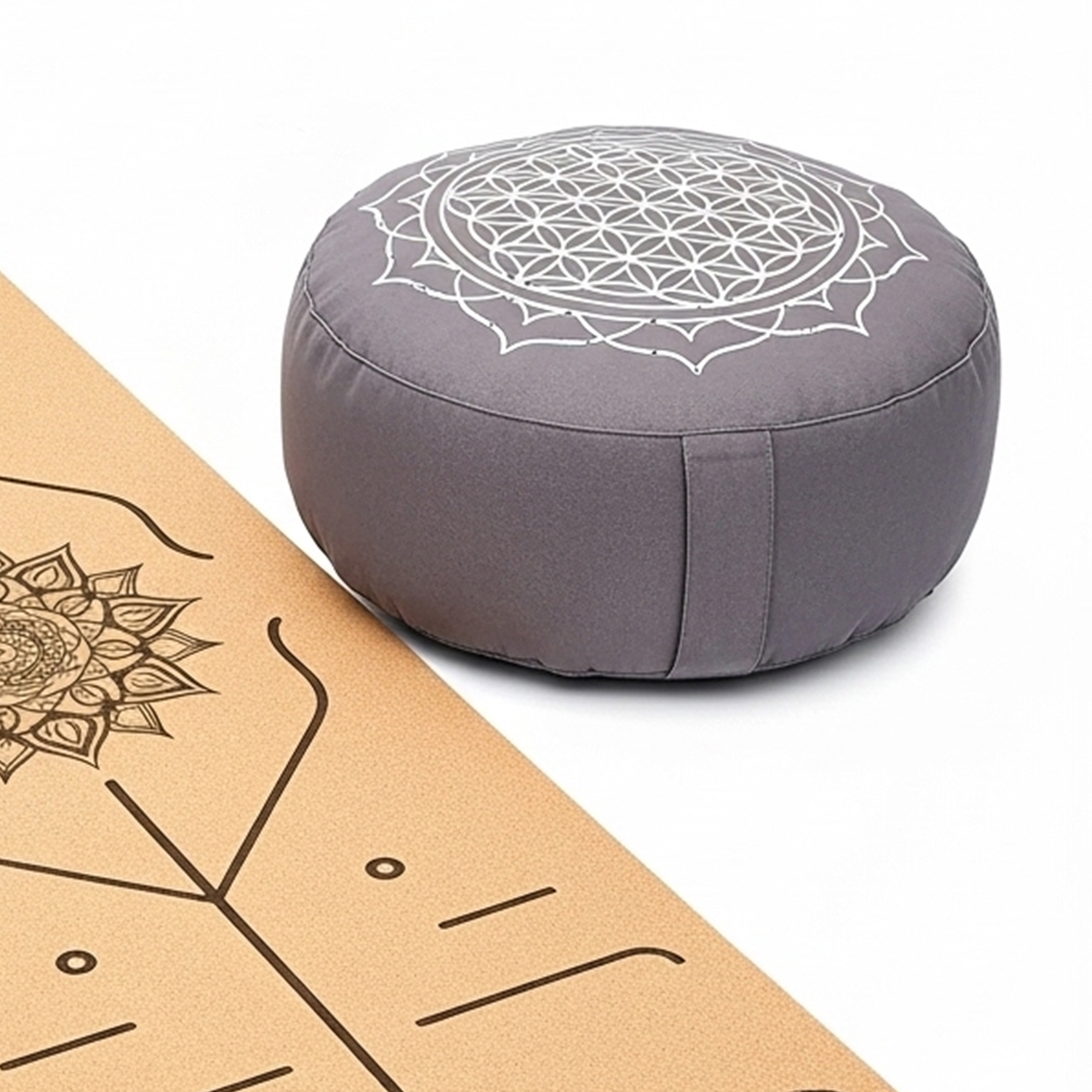 Das Yogakissen trägt die Darstellung der Blume des Lebens, die in ihrer symmetrischen Form oft mit Balance und innerer Ausrichtung verbunden wird. Die graue Farbgebung unterstreicht die ruhige Wirkung und fügt sich mühelos in verschiedene Raumgestaltungen ein. So wird das Kissen nicht nur zu einem funktionalen Bestandteil der Praxis, sondern auch zu einem stillen Impulsgeber für Klarheit und Konzentration.
