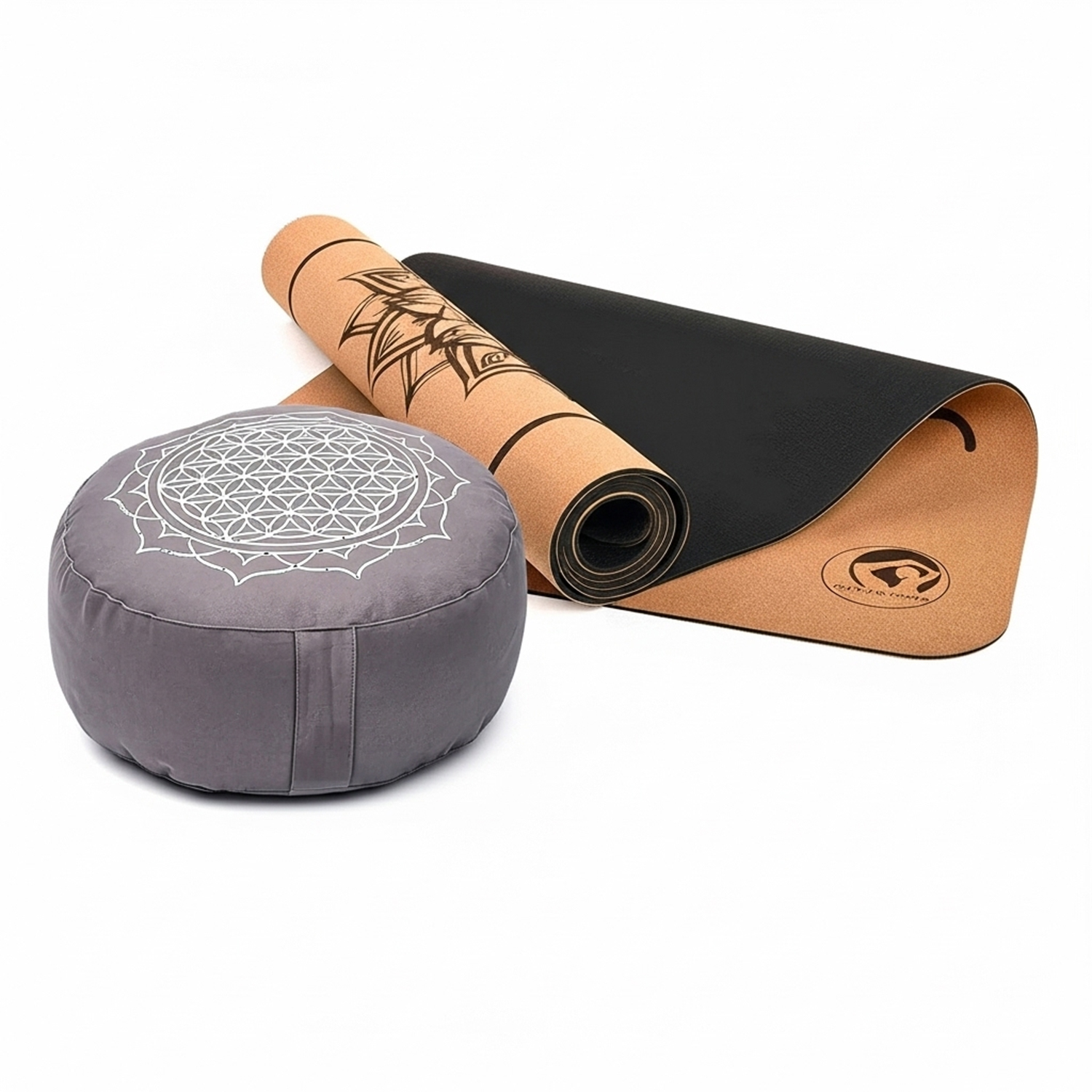 Dieses Set aus einer Kork-Naturkautschuk-Matte und einem Yogakissen mit der eingearbeiteten Blume des Lebens in Grau lädt dazu ein, den eigenen Übungsraum mit neuer Energie zu erfüllen. Die Materialien und die ruhige Farbgebung unterstützen eine Atmosphäre, die Körper und Geist während jeder Praxis harmonisch verbindet. So entsteht ein angenehmer Rahmen, in dem Bewegung, Atmung und Achtsamkeit sanft miteinander verschmelzen können.
