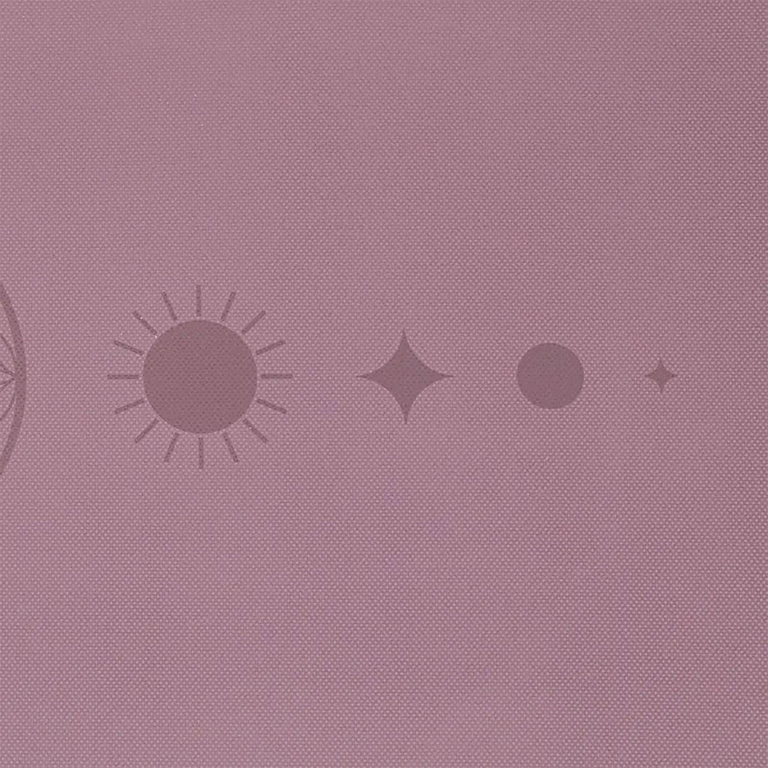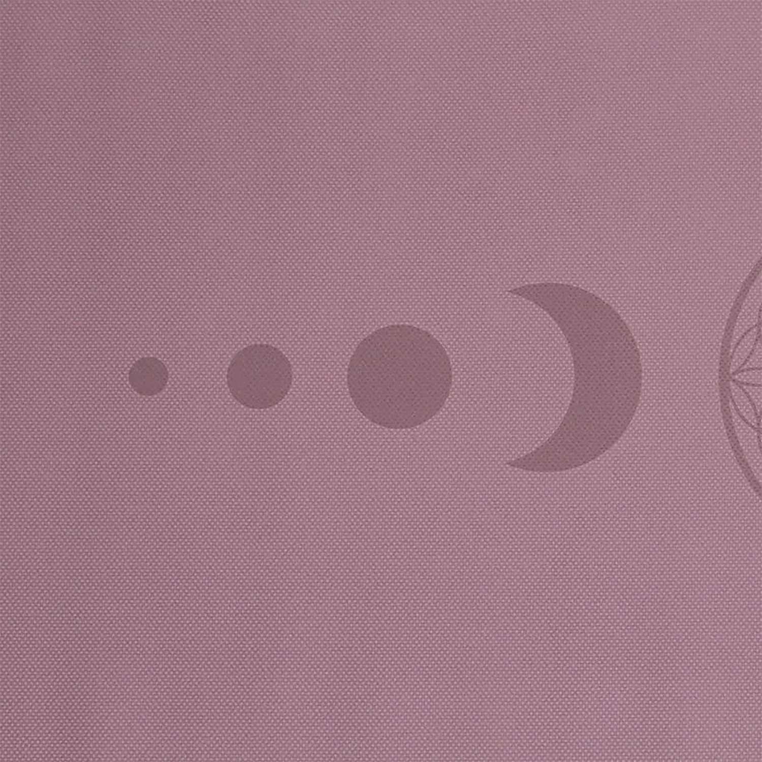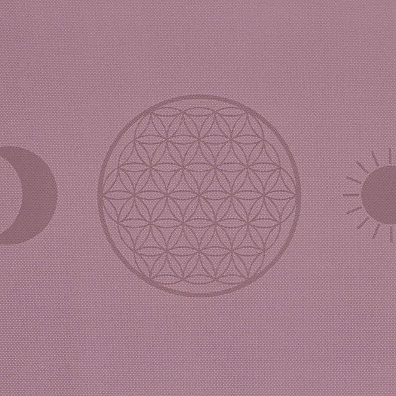 Die Oberfläche der Matte zeigt das Motiv „Blume des Lebens“, das sich klar und sauber abzeichnet. Das Muster ist gleichmäßig integriert und ergänzt die violette Grundfarbe. Diese Kombination sorgt für eine ruhige visuelle Wirkung, die viele Anwender als angenehm für die Yogapraxis empfinden. Das Design bleibt während der Nutzung gut sichtbar und trägt zur ansprechenden Gesamtwirkung der Matte bei. Die grafische Gestaltung ist so integriert, dass sie sich weder abnutzt noch während der Anwendung stört.