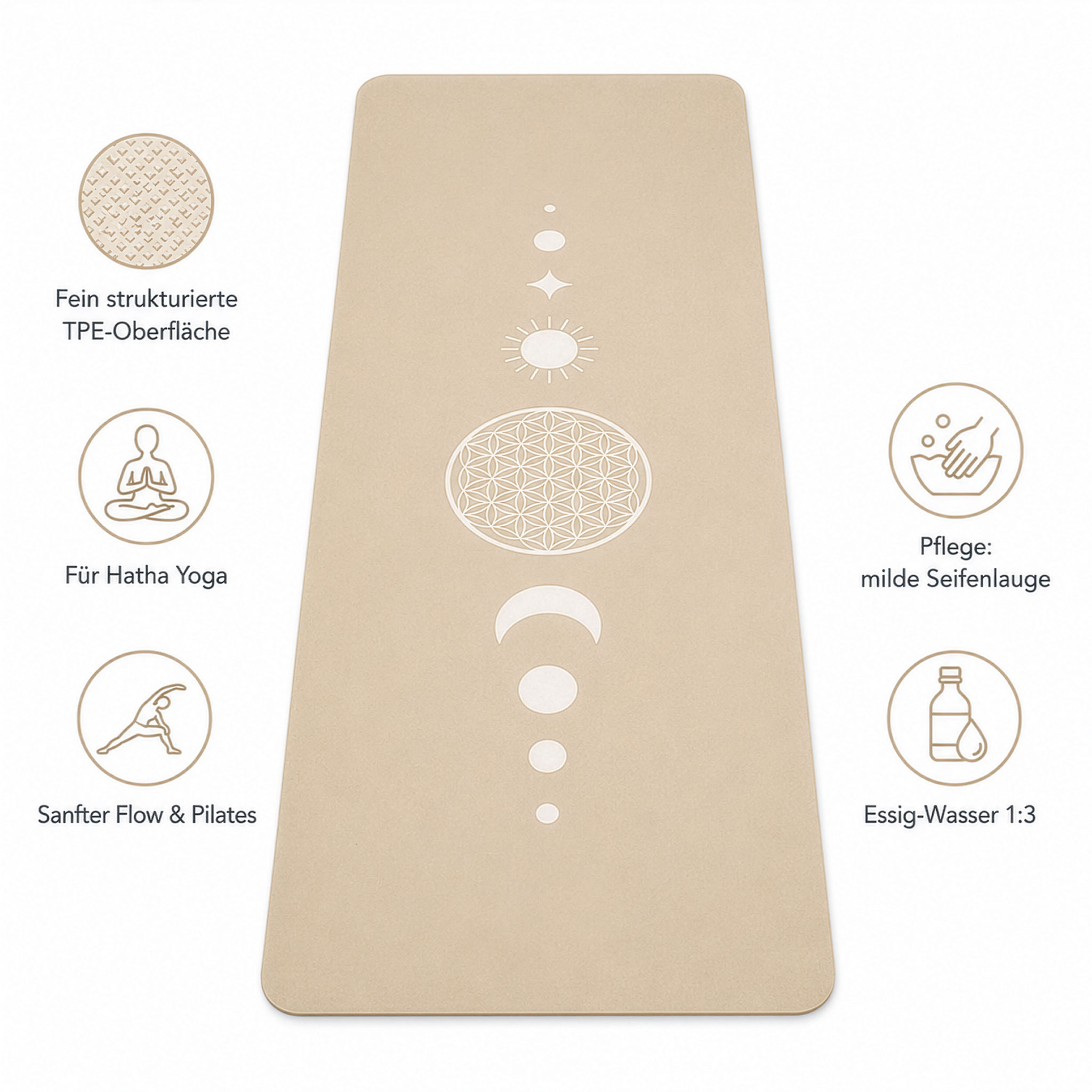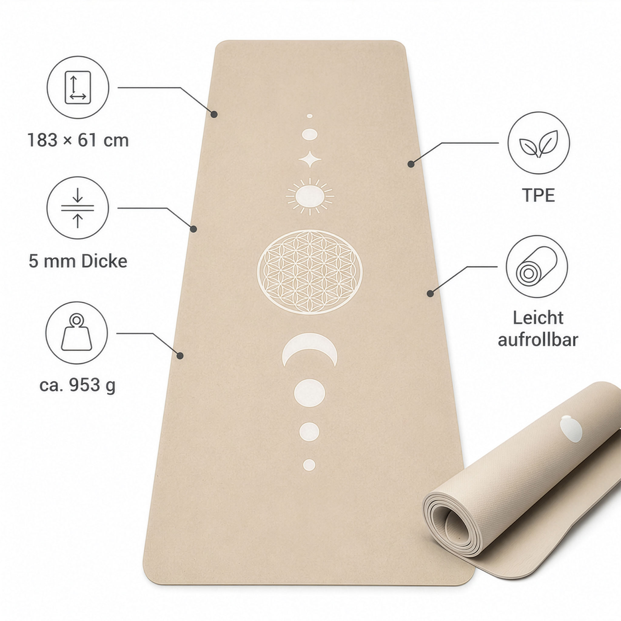 Diese TPE-Yogamatte von Yogi & Yogini verbindet eine leichte, pflegeleichte Materialbasis mit einem ruhigen Blume-des-Lebens-Motiv. Der warme Beigeton wirkt zurückhaltend und passt gut in Wohnräume, Yogaräume und helle Studioumgebungen. Mit 183 × 61 cm bietet die Matte etwas mehr Länge als viele Standardmatten und bleibt mit ca. 953 g angenehm leicht zu transportieren.